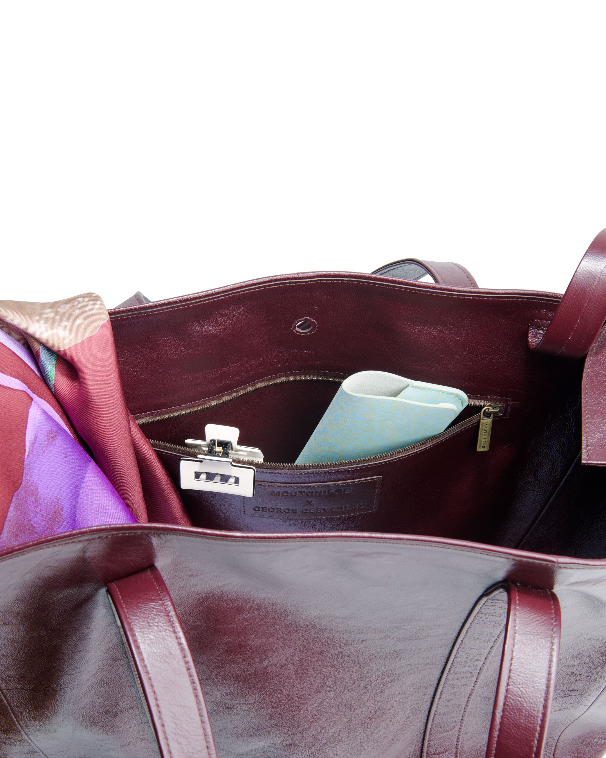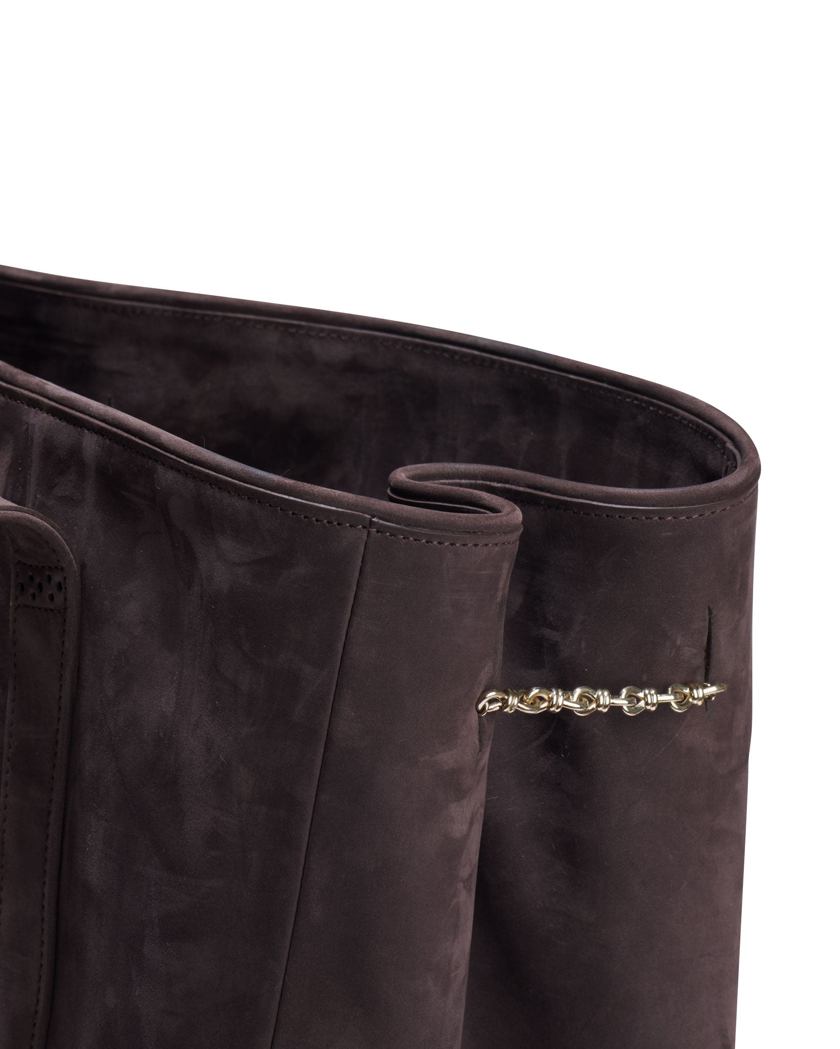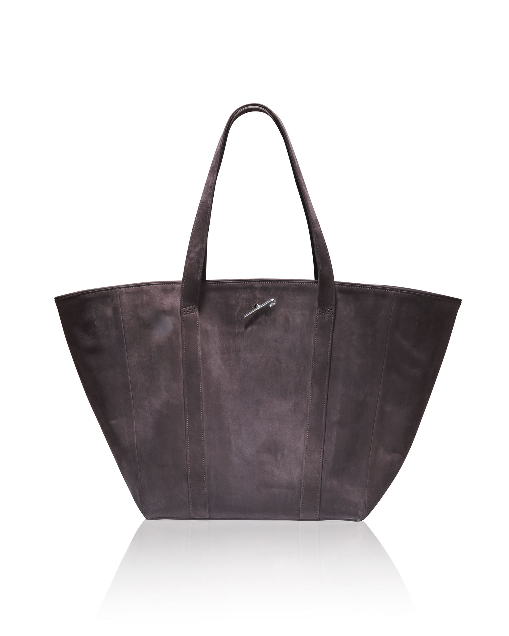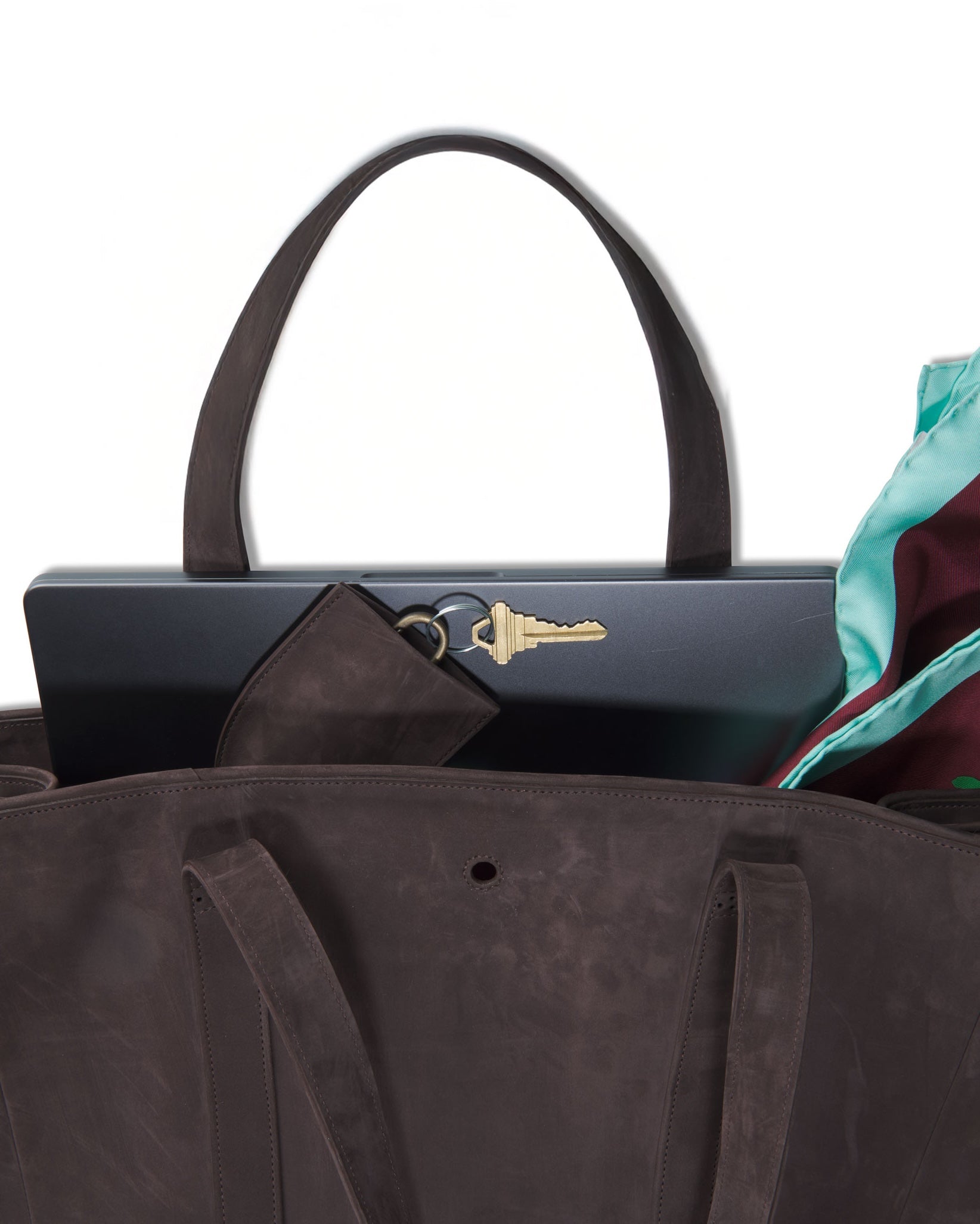 Offered in Chocolate Nubuck Suede, Oxblood Kangaroo, Black Pebbled Calf Leather, Oatmeal Calf, and Sand Calf, each tote is produced in limited quantities.