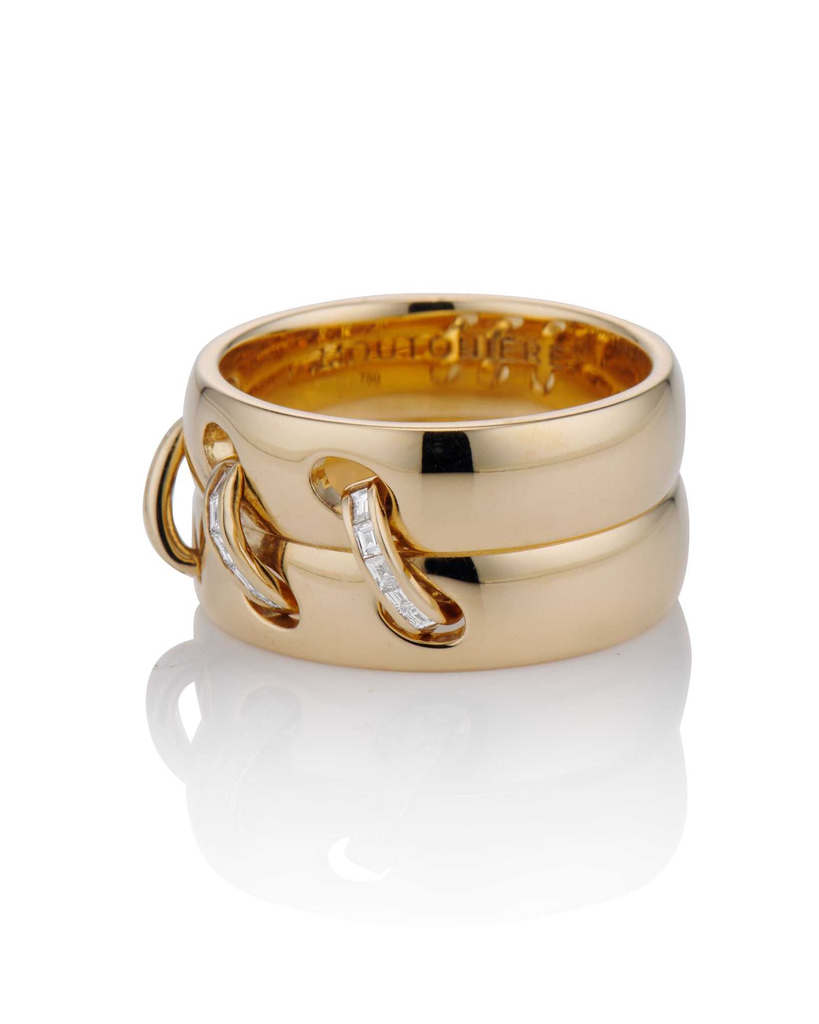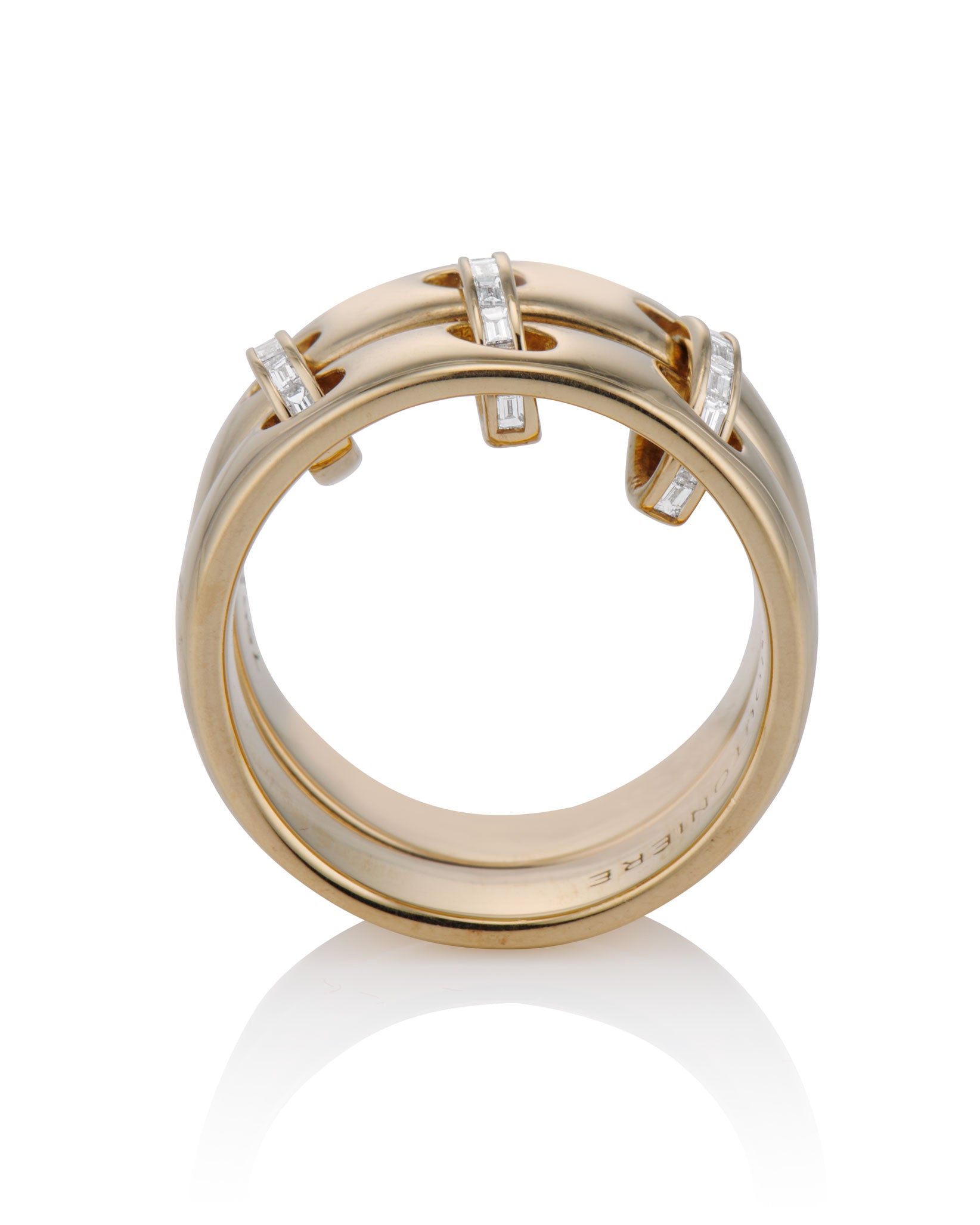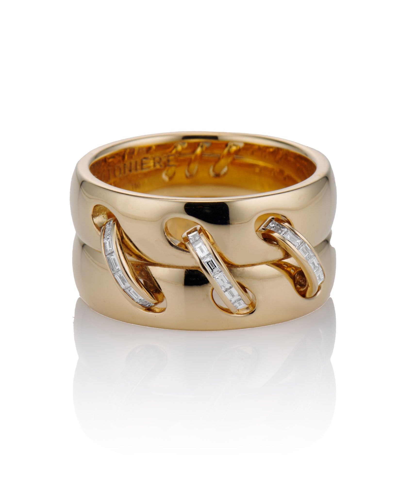 The diamonds glint like fragments of starlight caught in motion, their linear brilliance contrasting with the gold’s warm, fluid curves. Balanced and bold, the band embodies both gravity and grace—a celestial alignment rendered in metal and light.