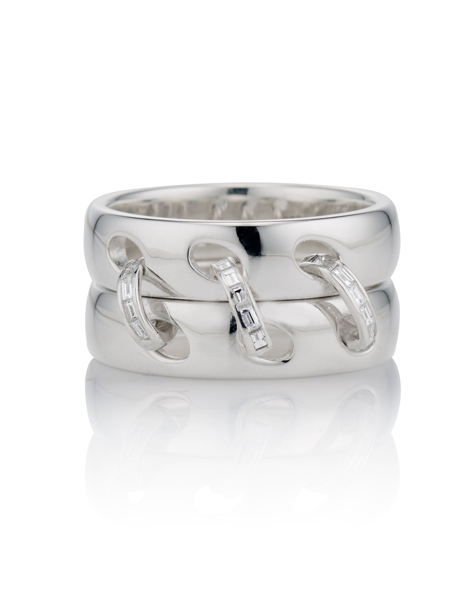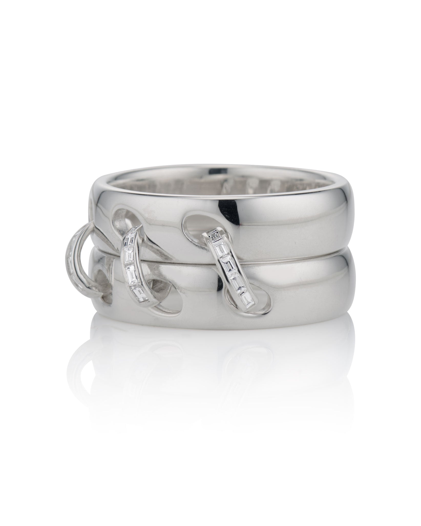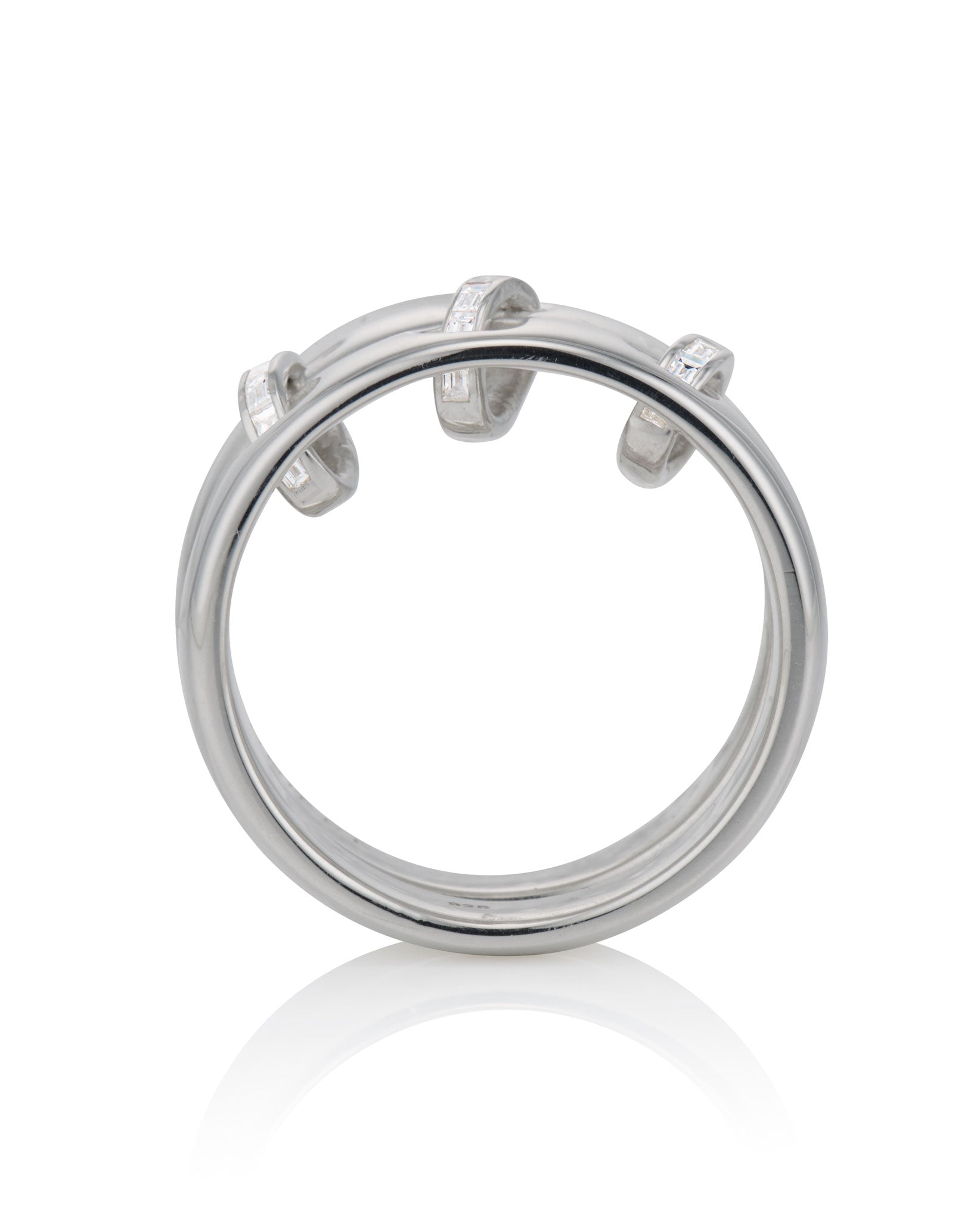 The Celeste Band is an homage to the quiet geometry of the cosmos—an eternal ring of light and precision. Crafted in 18-karat gold or sterling silver, its sculptural double band is threaded with arcs of baguette-cut diamonds, each stone channel-set with architectural clarity to trace the arc of an orbit.