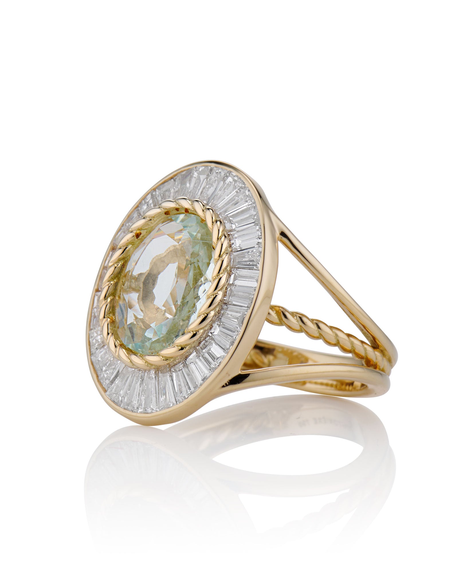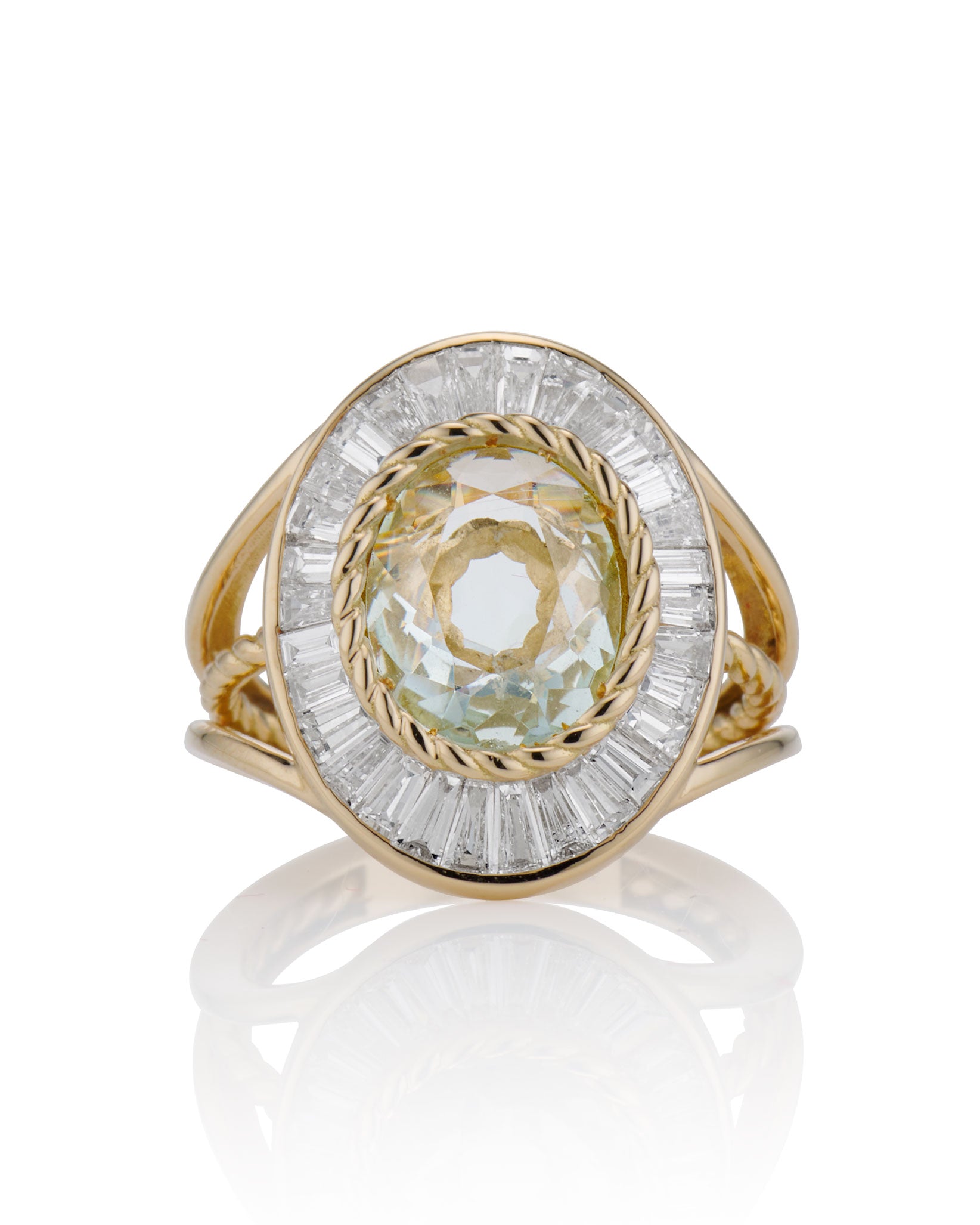 The Solaris Ring celebrates the radiance of light itself—a contemporary talisman inspired by the sun’s eternal cycle of rise and return. At its heart lies a luminous aquamarine, its pale fire encircled by a constellation of baguette-cut diamonds that echo rays of light in perfect symmetry.