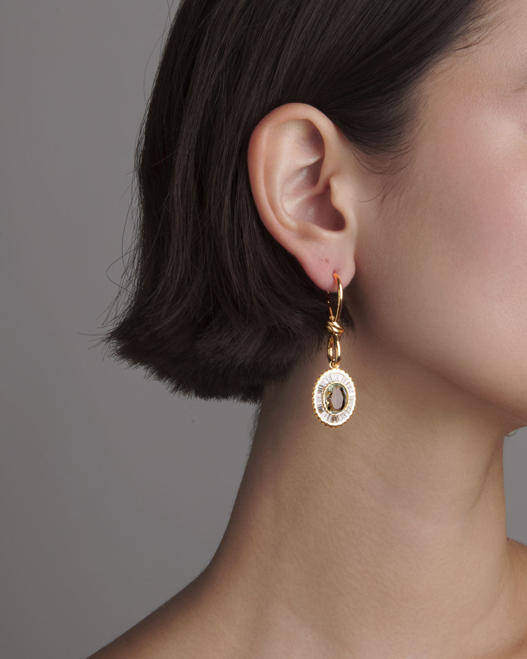 Designed to illuminate, the pendant’s faceted surface reflects light with sunlit clarity, while the diamond surround offers a celestial shimmer that feels both regal and restrained. Whether worn from the Knot Earrings, Knot Necklace, or Knot Brooch it transforms with movement—an orbit of light close to the skin.
