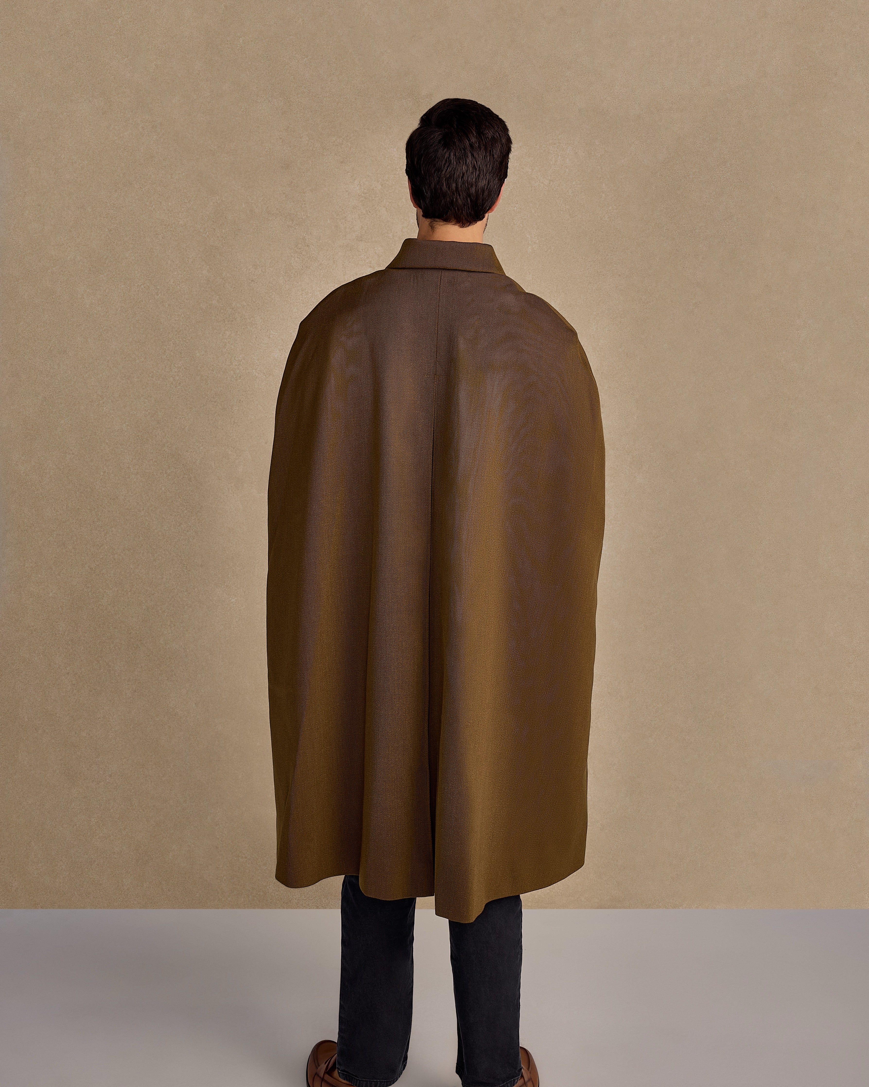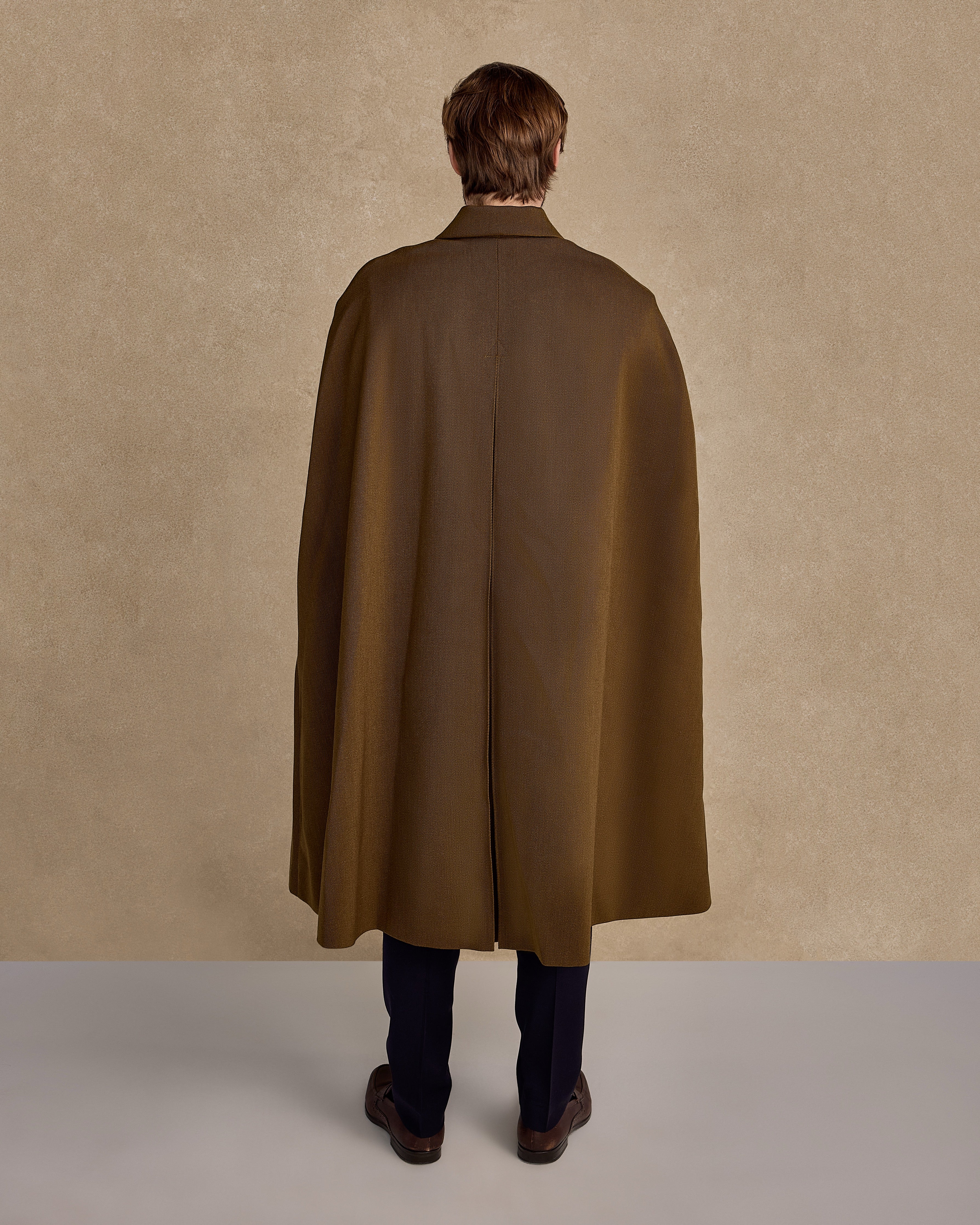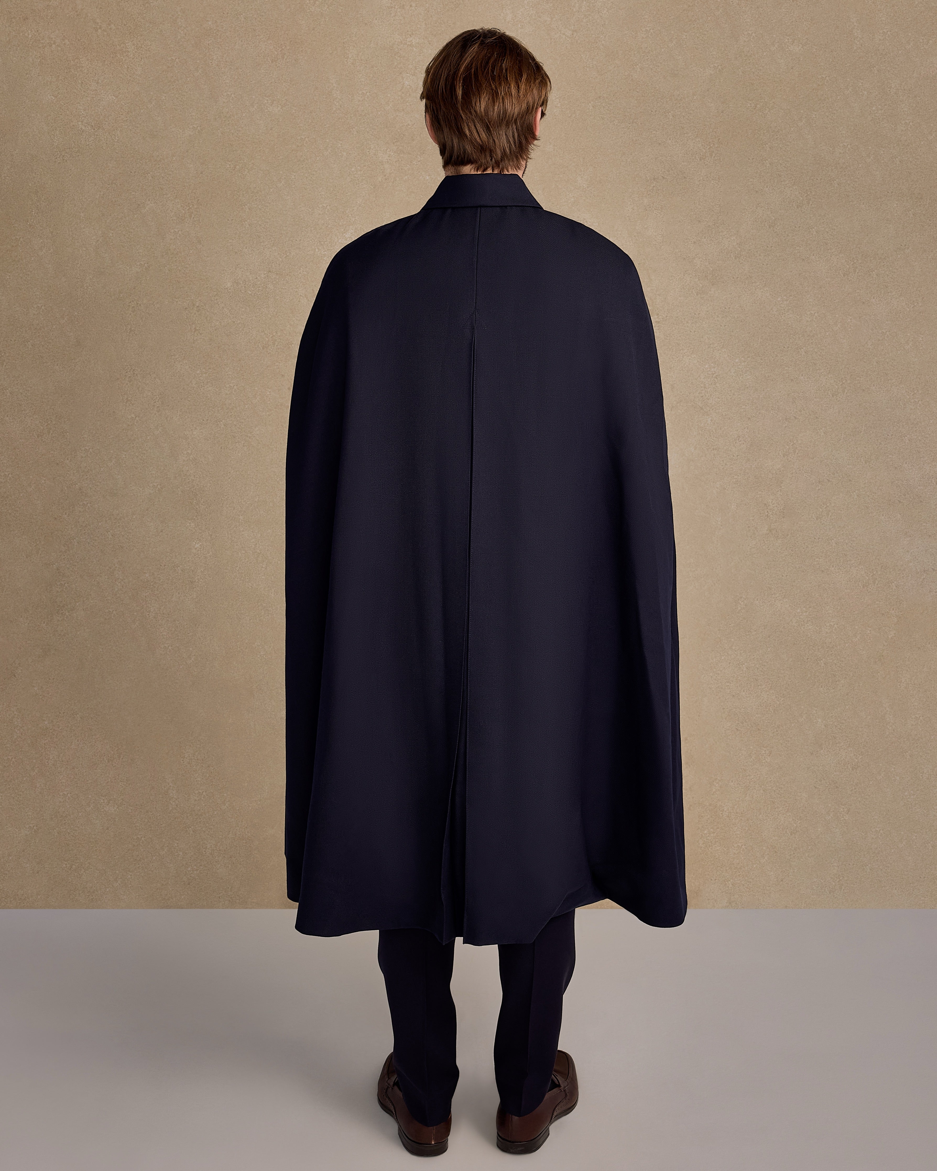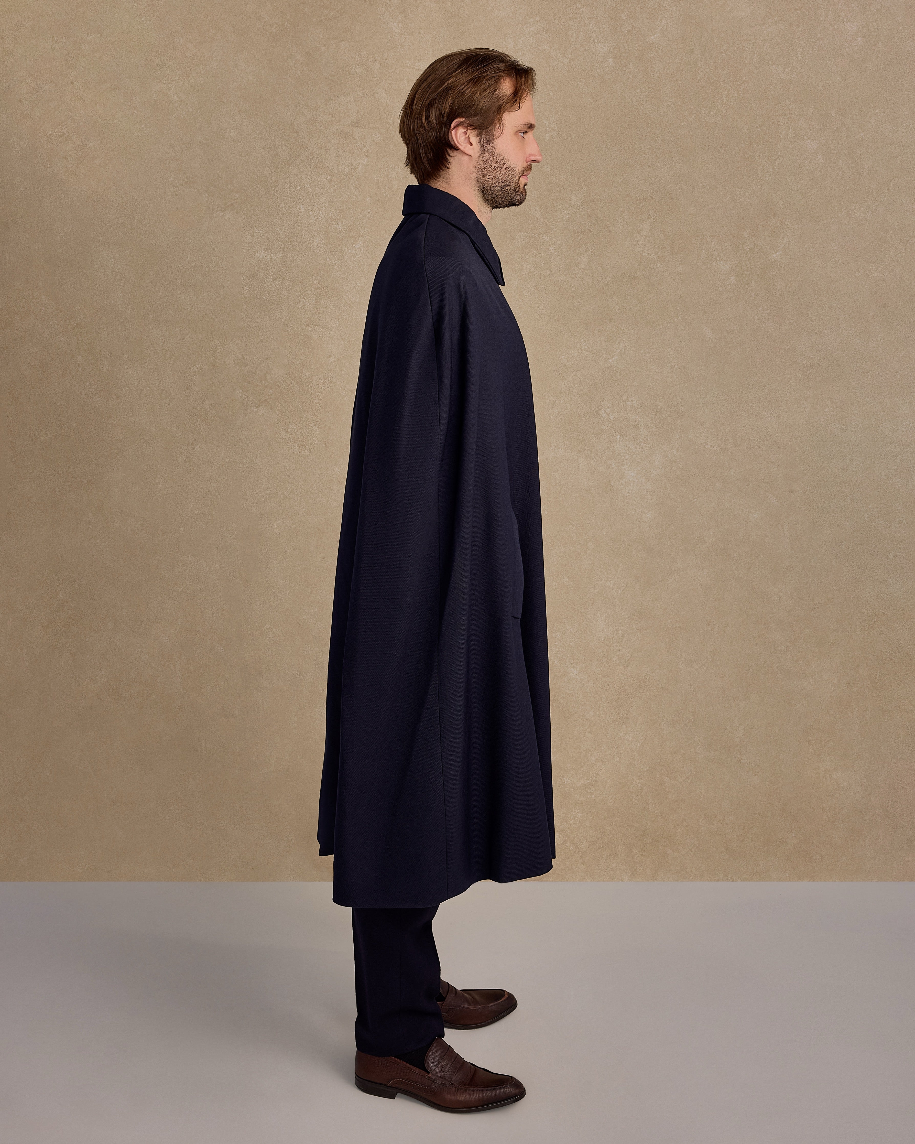 A modern interpretation of heritage outerwear, the Cavalry Cloak is made in 100% Merino Wool to drape the shoulders in sculptural simplicity. Discreet arm slits and a pointed collar lend balance to its protective, flowing form, which is long enough to cover a briefcase or bag in the rain.