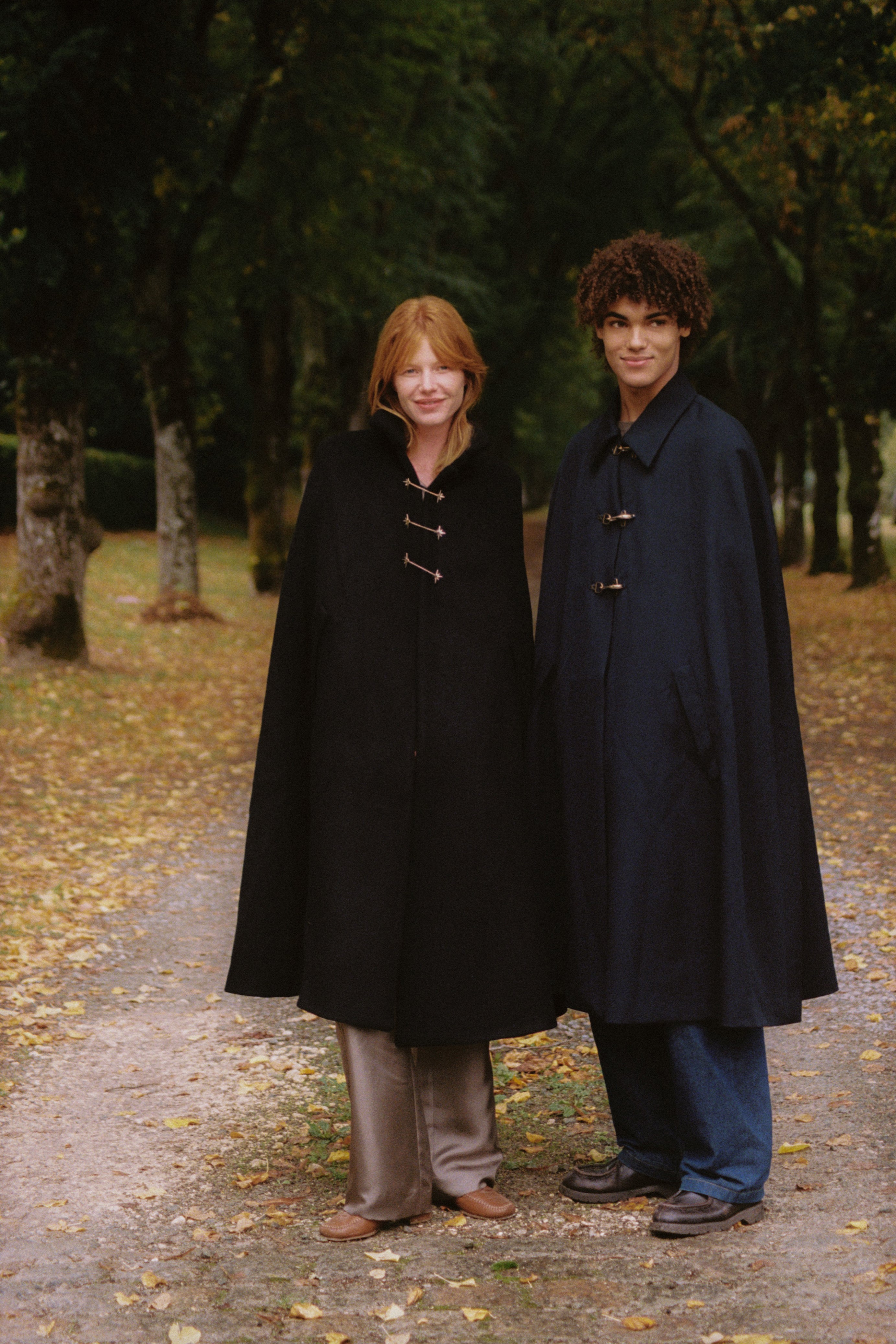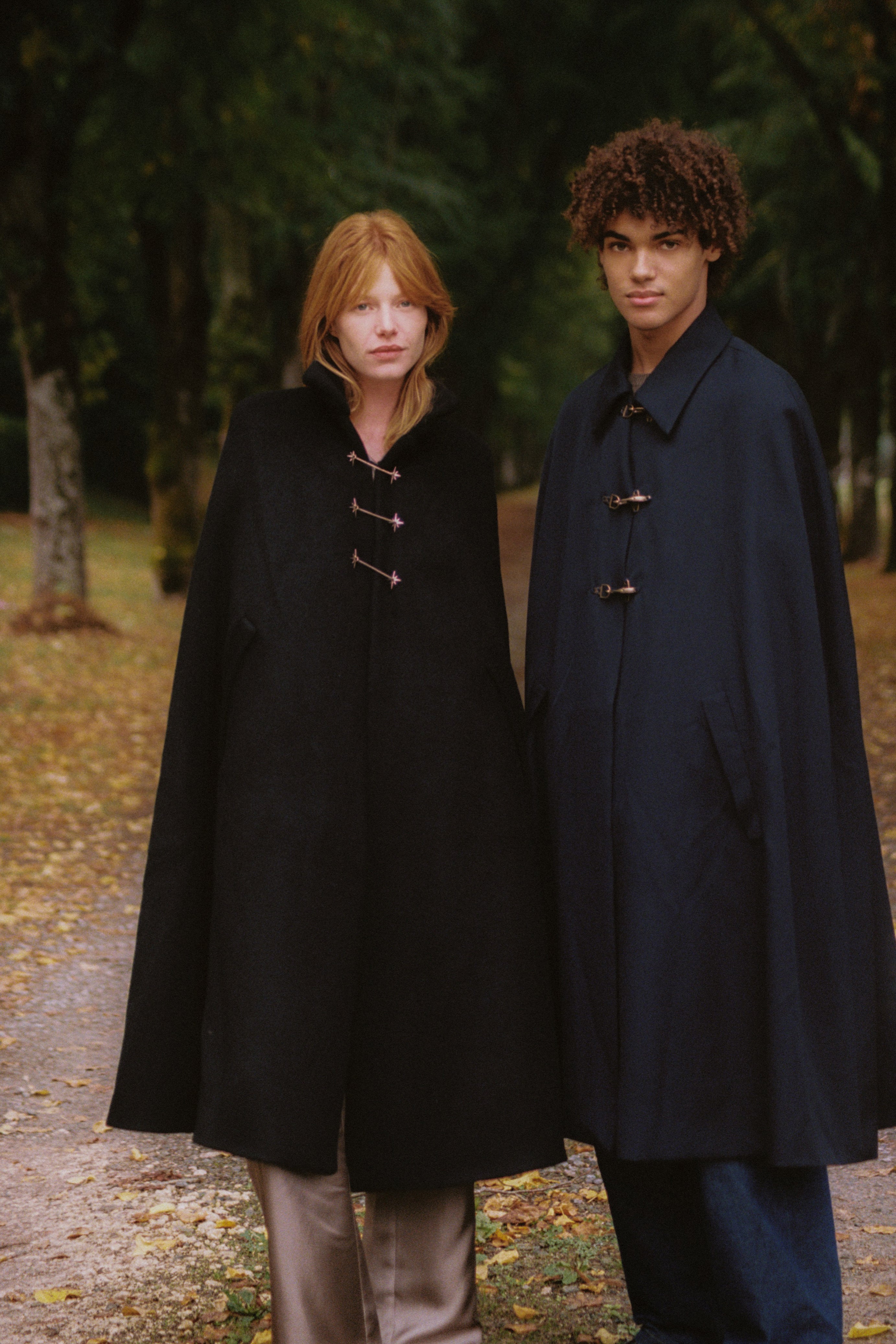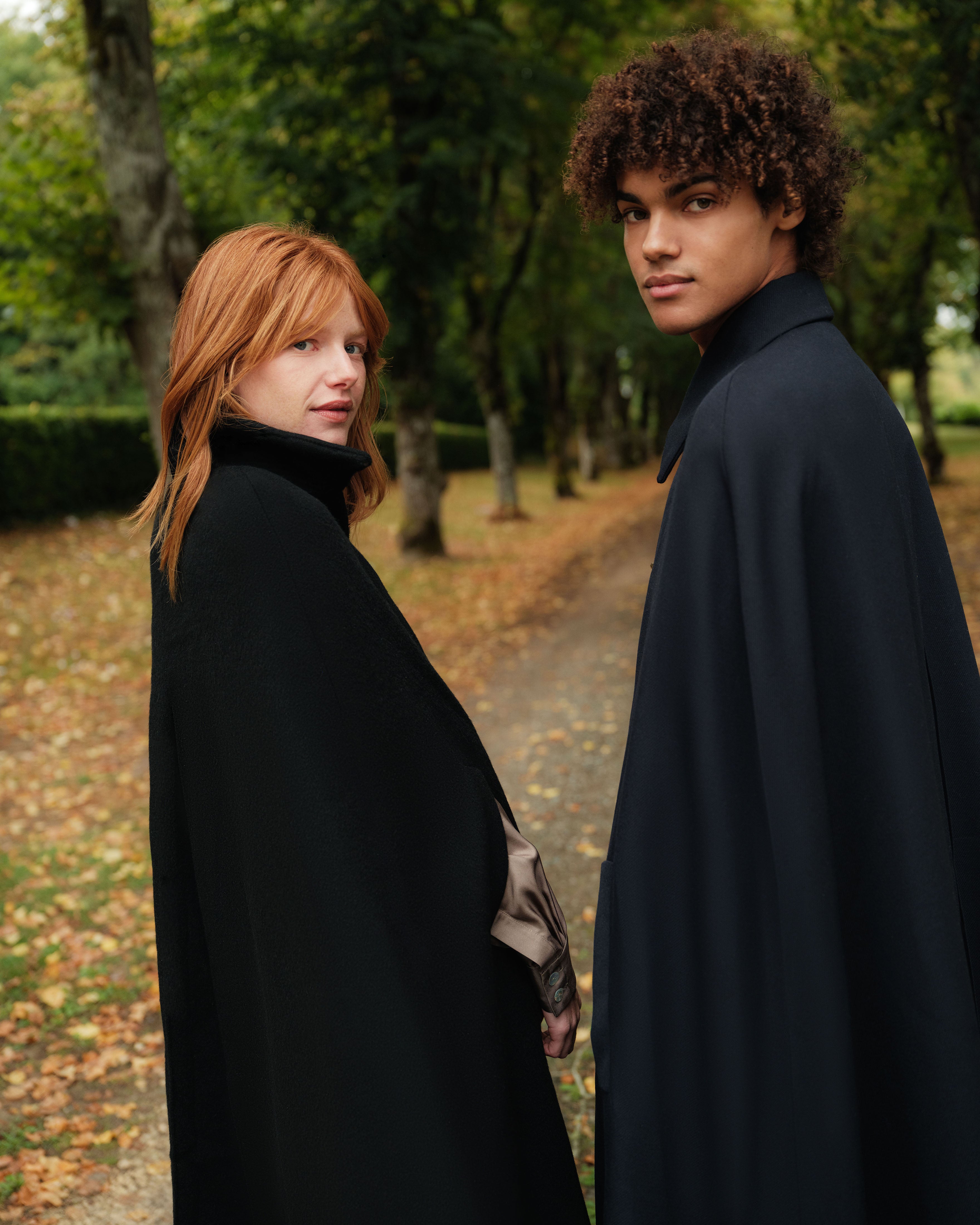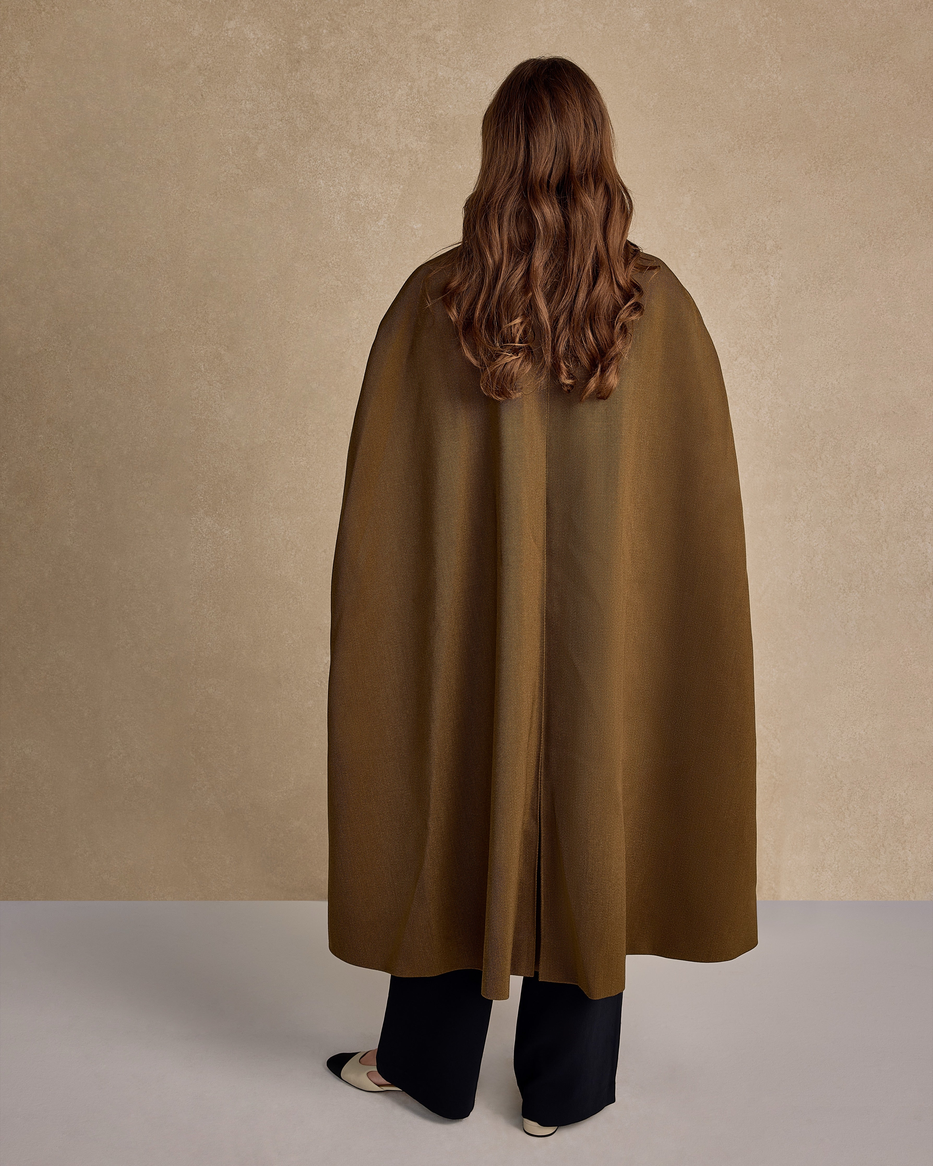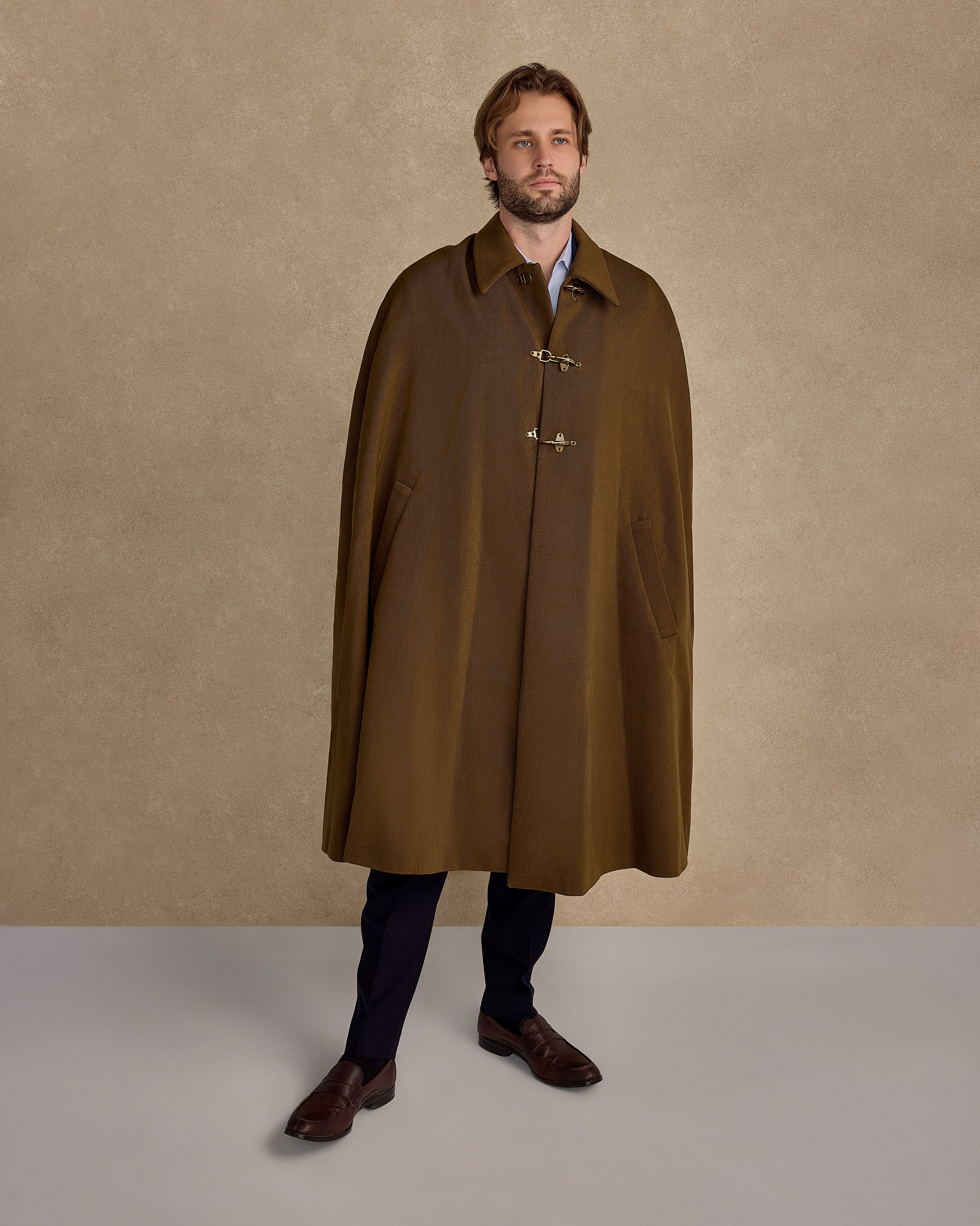 A modern interpretation of heritage outerwear, the Cavalry Cloak is made in 100% Merino Wool to drape the shoulders in sculptural simplicity. Discreet arm slits and a pointed collar lend balance to its protective, flowing form, which is long enough to cover a briefcase or bag in the rain.