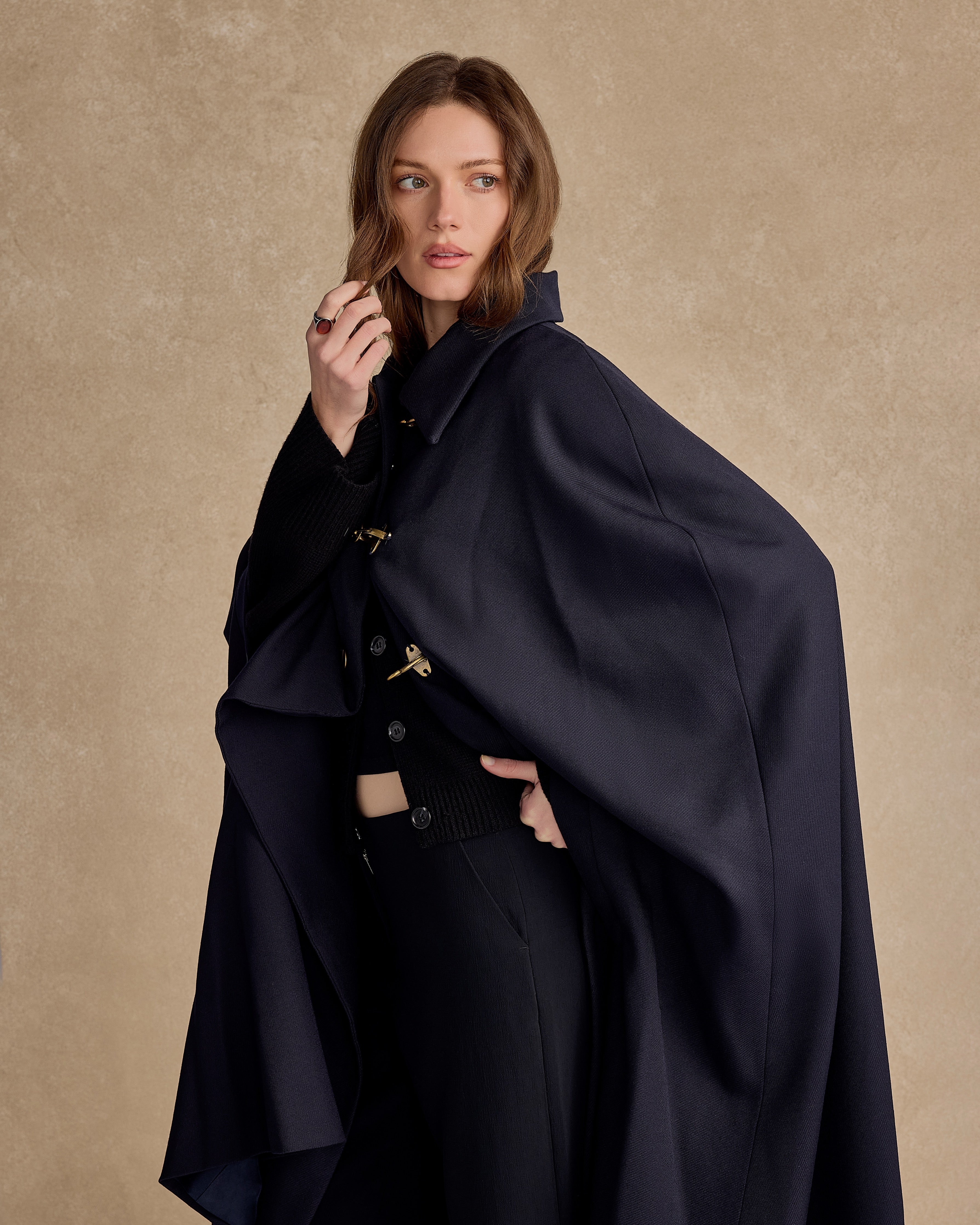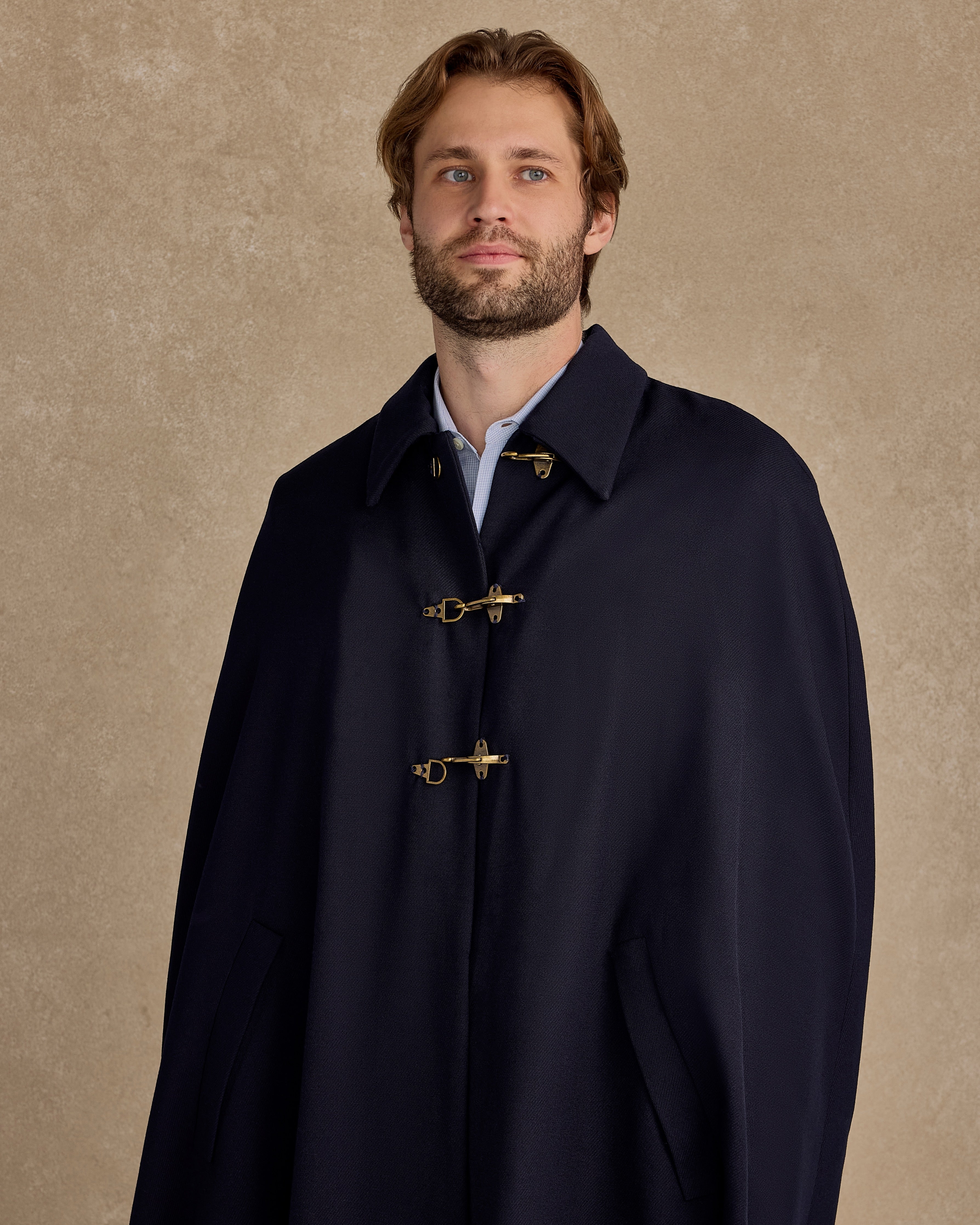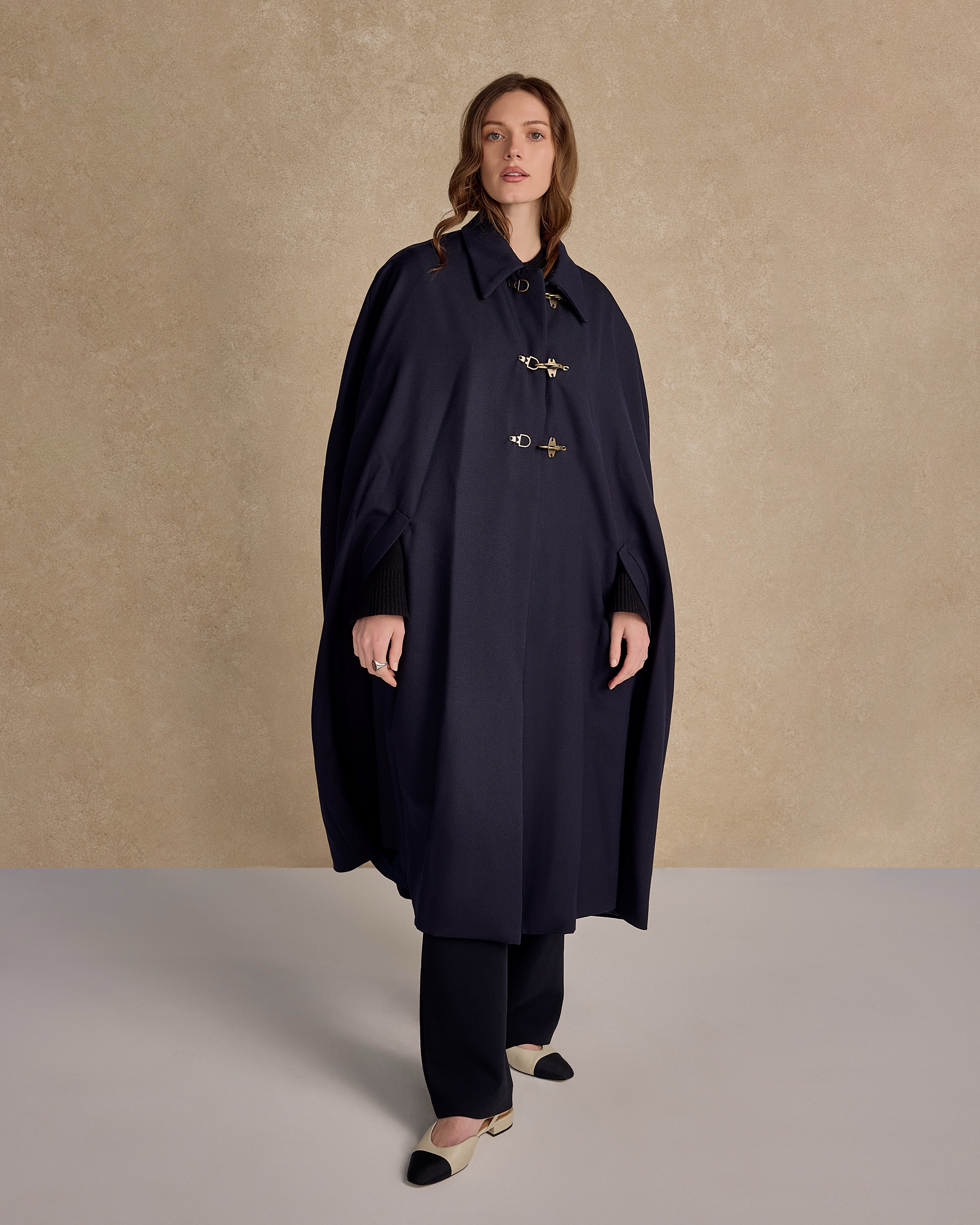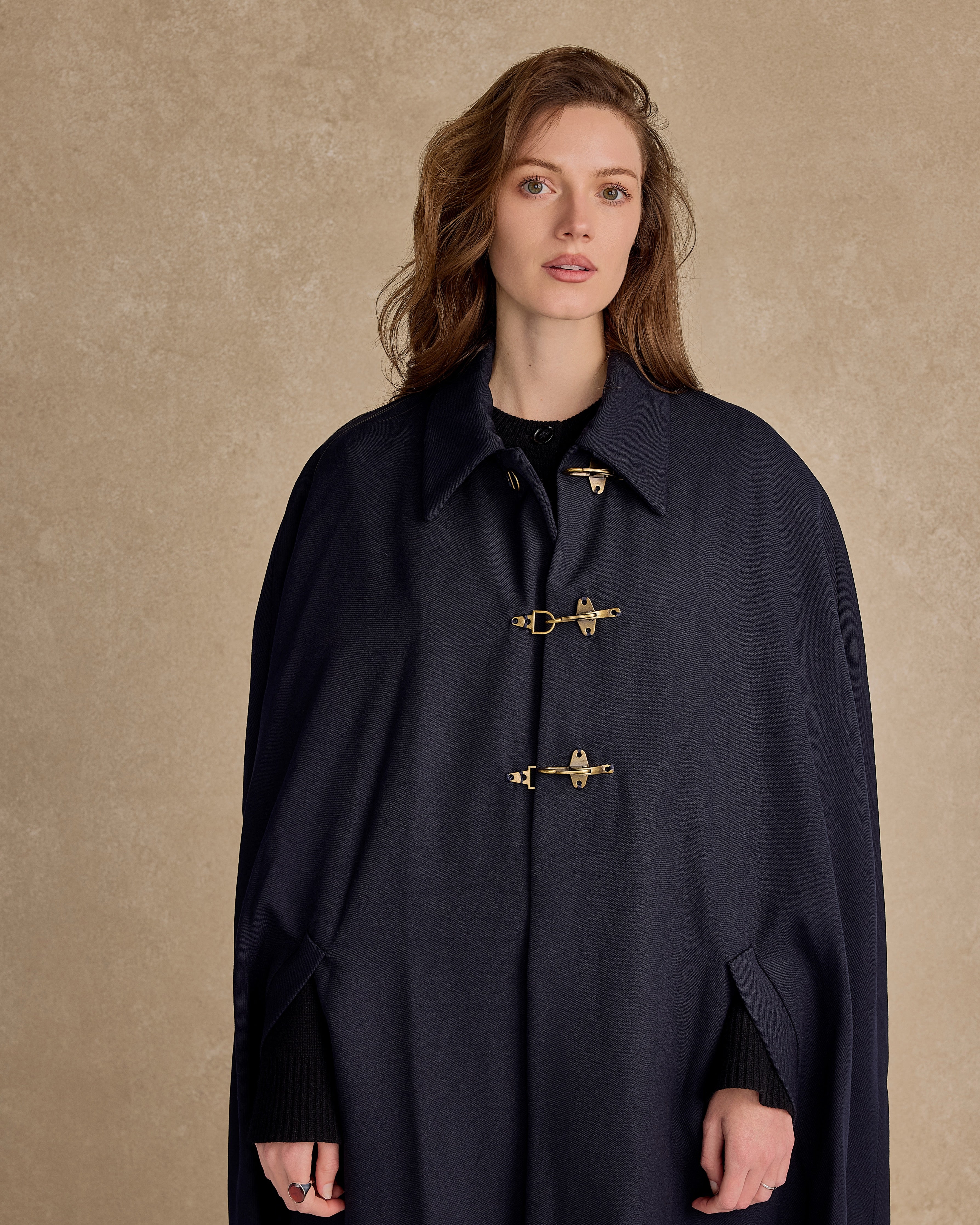 Three fireman clasps in solid brass secure the front, utilitarian details reimagined with elegance. Offered in both Navy and Khaki 100% Merino Wool with 100% silk lining.  Relaxed and architectural, designed for ease over tailoring or knitwear. A piece of timeless presence and quiet strength.