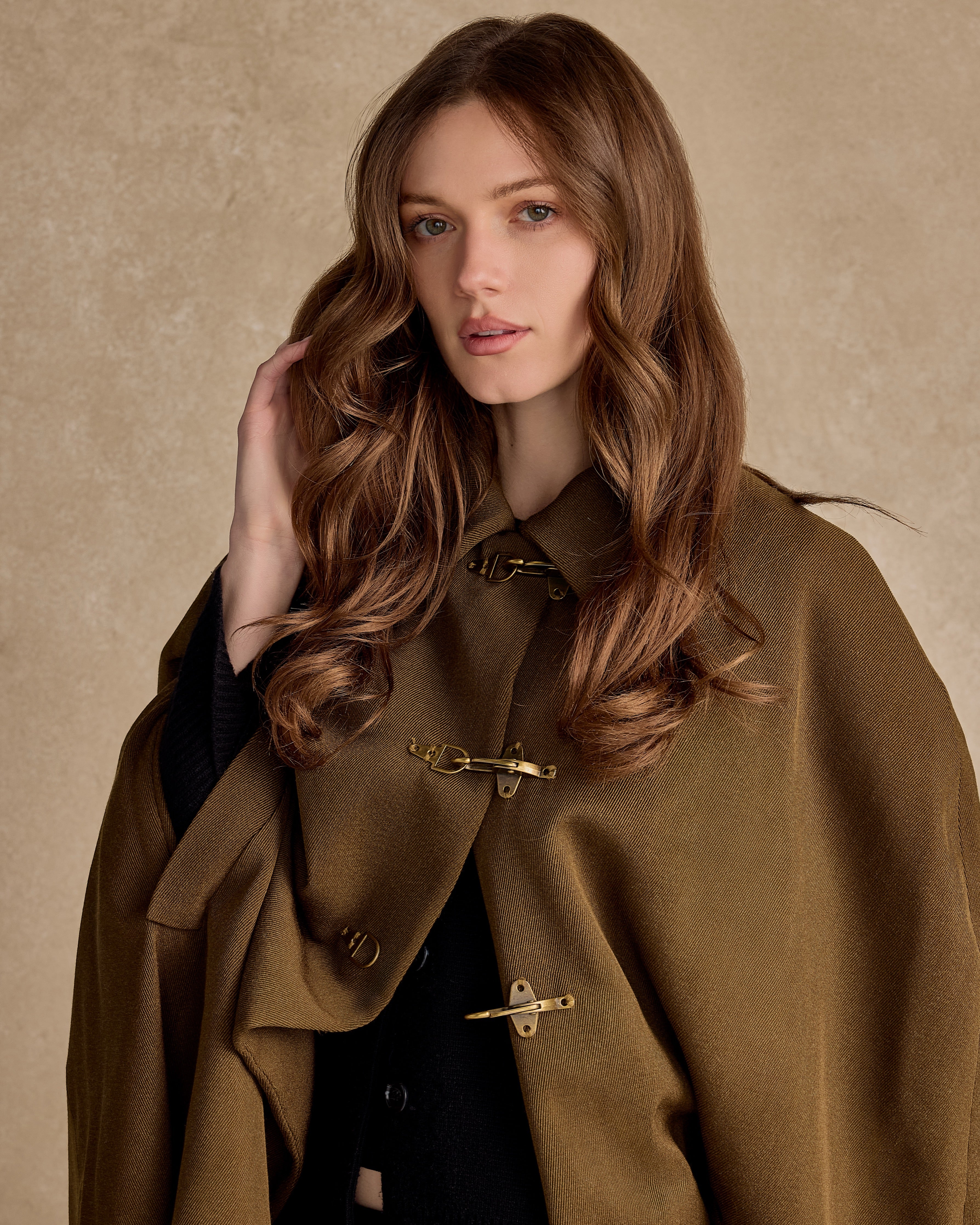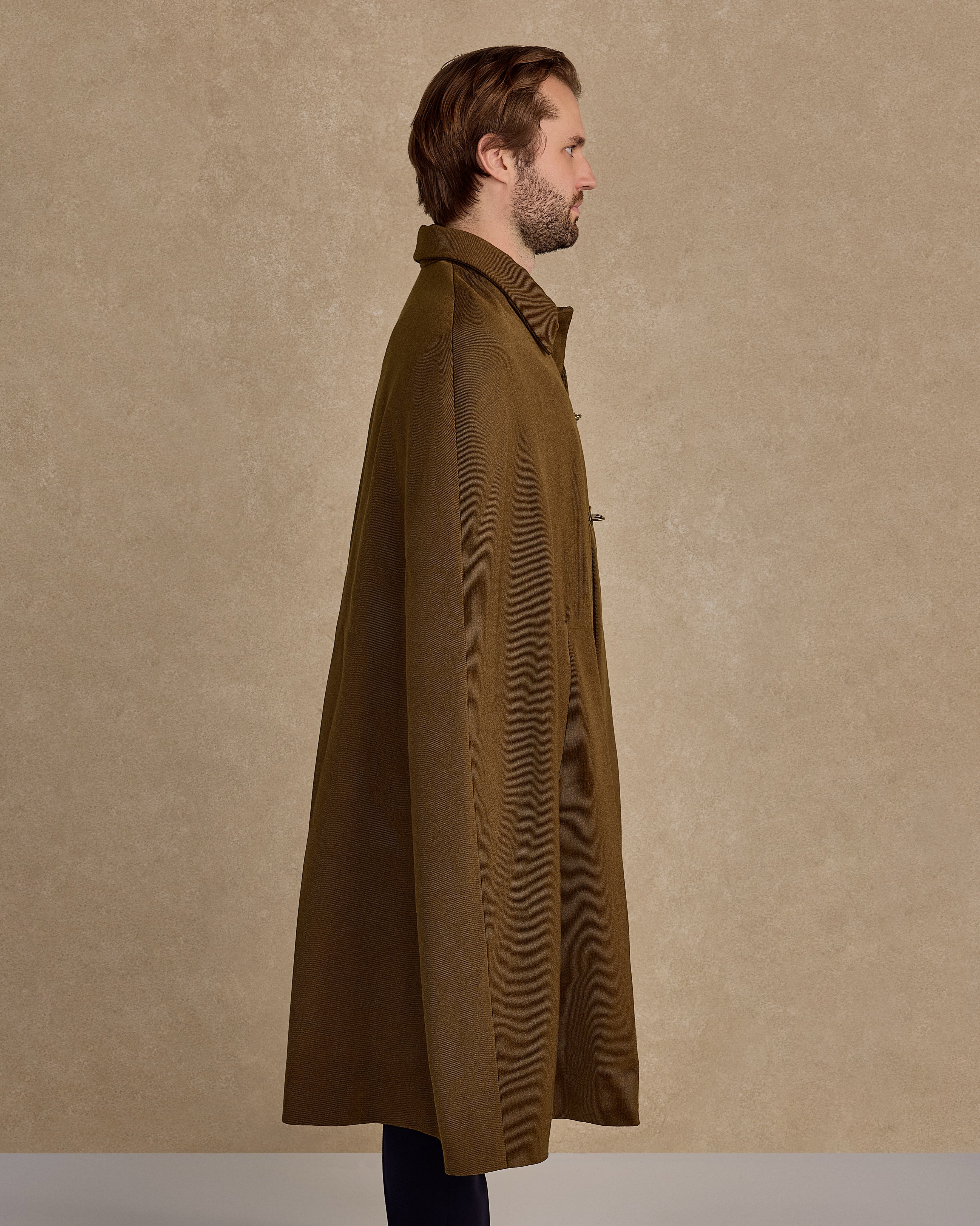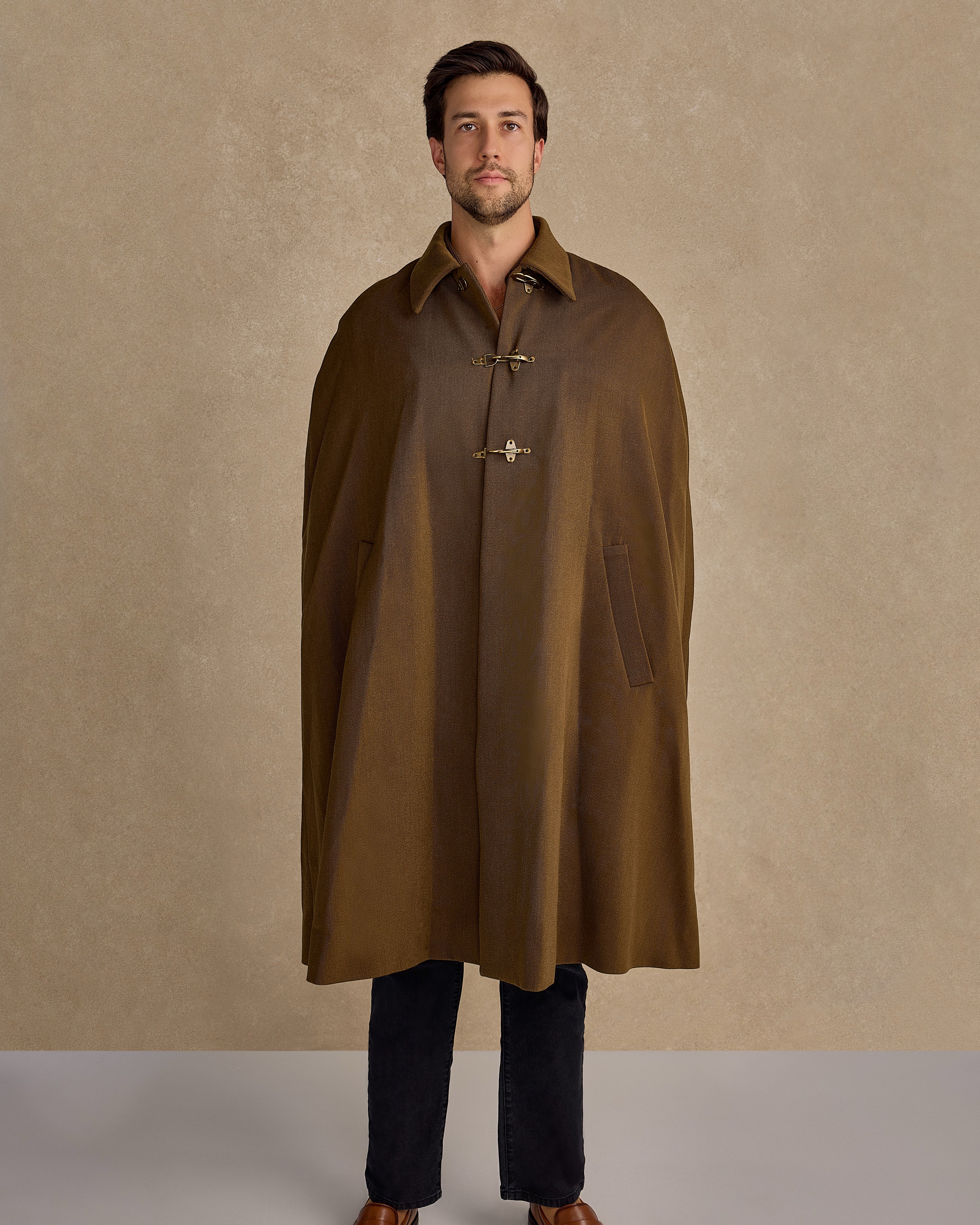 Three fireman clasps in solid brass secure the front, utilitarian details reimagined with elegance. Offered in both Navy and Khaki 100% Merino Wool with 100% silk lining.  Relaxed and architectural, designed for ease over tailoring or knitwear. A piece of timeless presence and quiet strength.