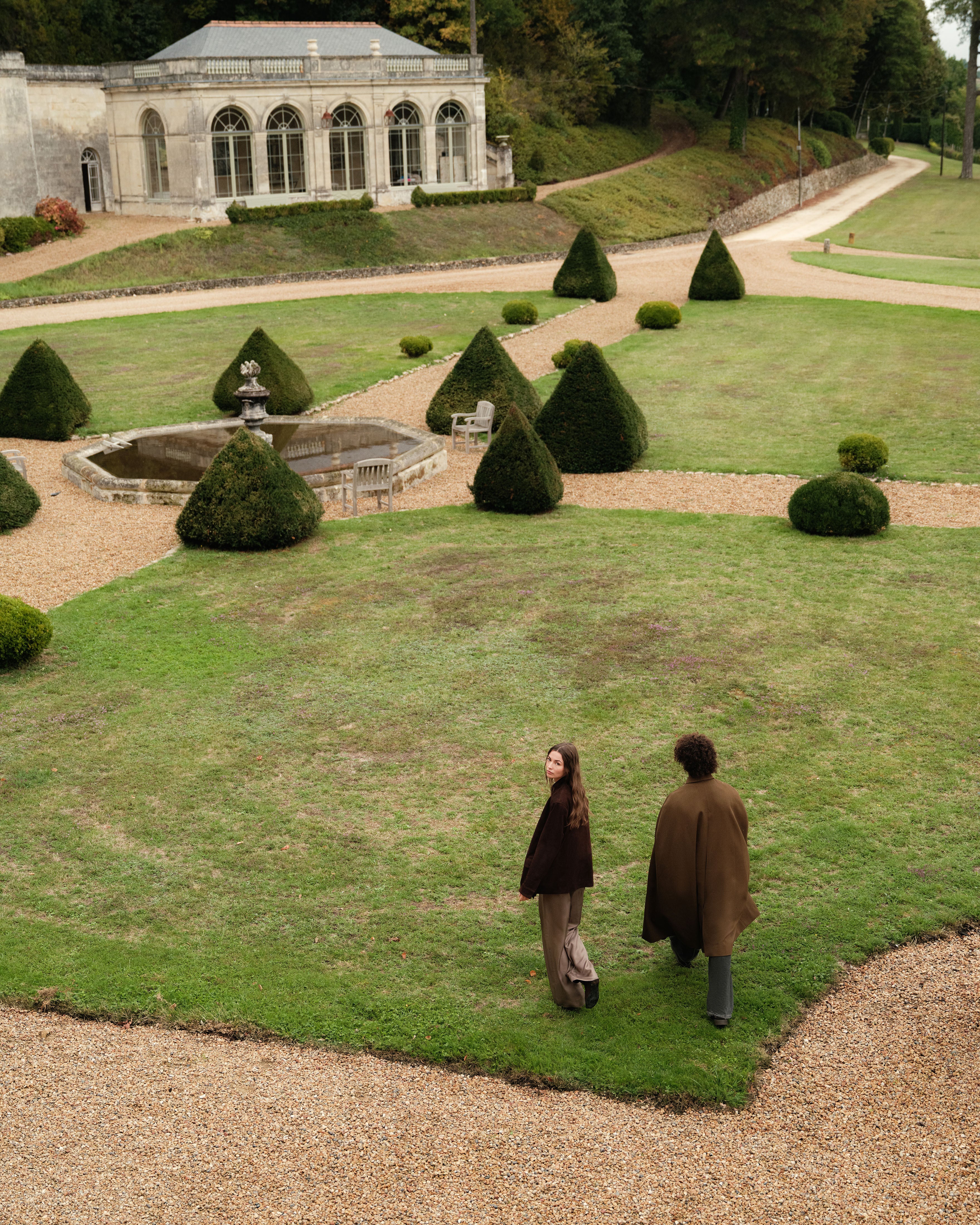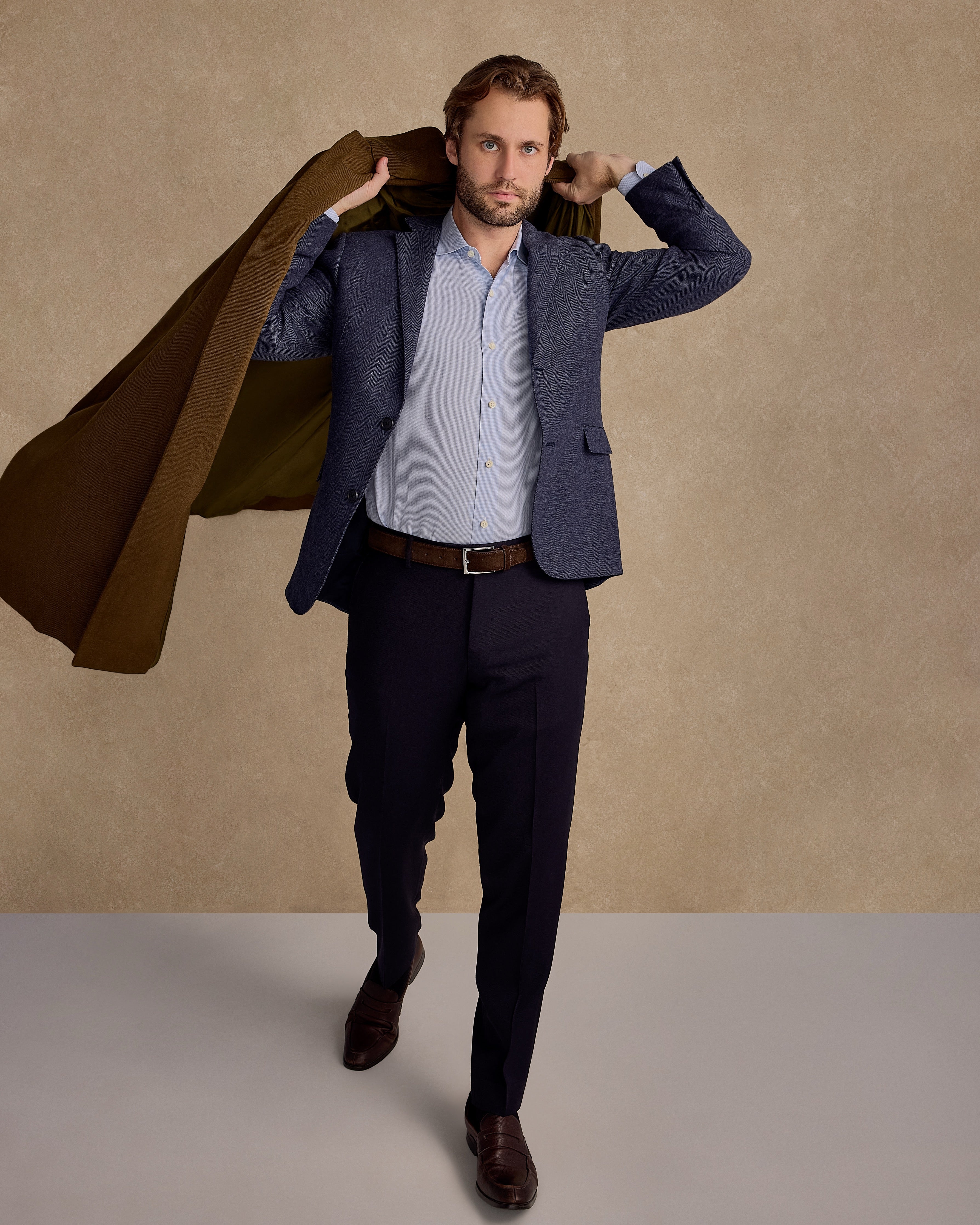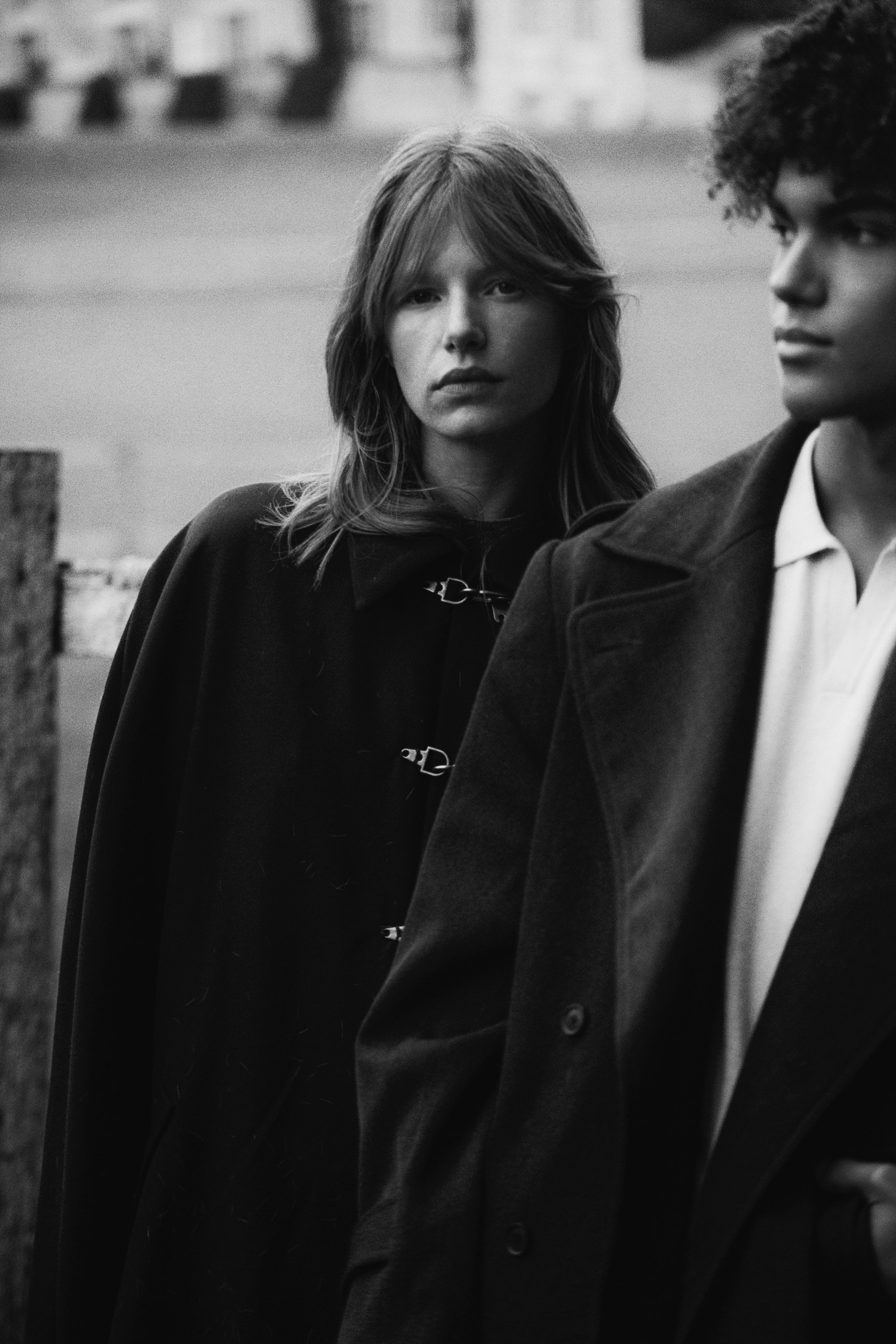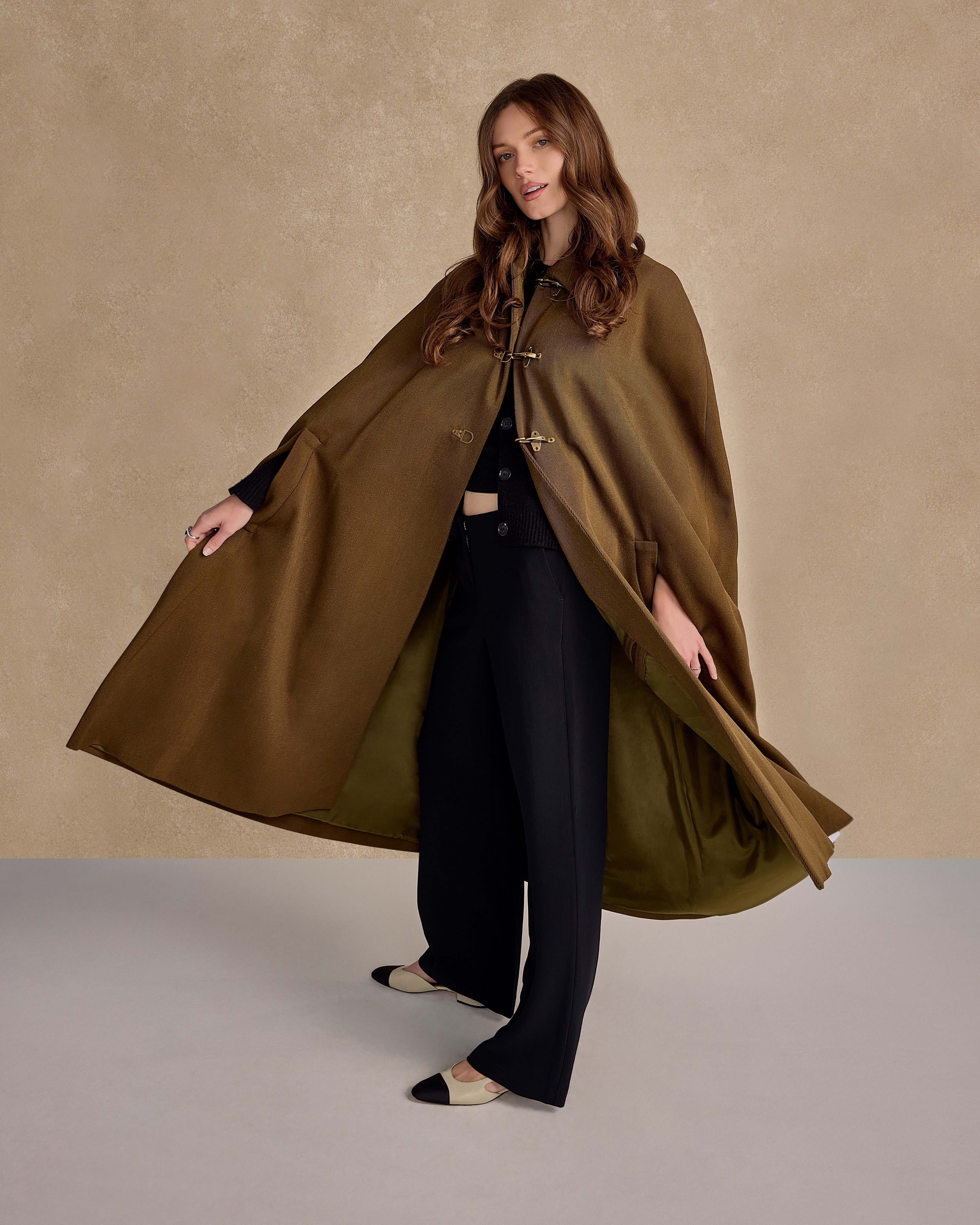 Three fireman clasps in solid brass secure the front, utilitarian details reimagined with elegance. Offered in both Navy and Khaki 100% Merino Wool with 100% silk lining.  Relaxed and architectural, designed for ease over tailoring or knitwear. A piece of timeless presence and quiet strength.