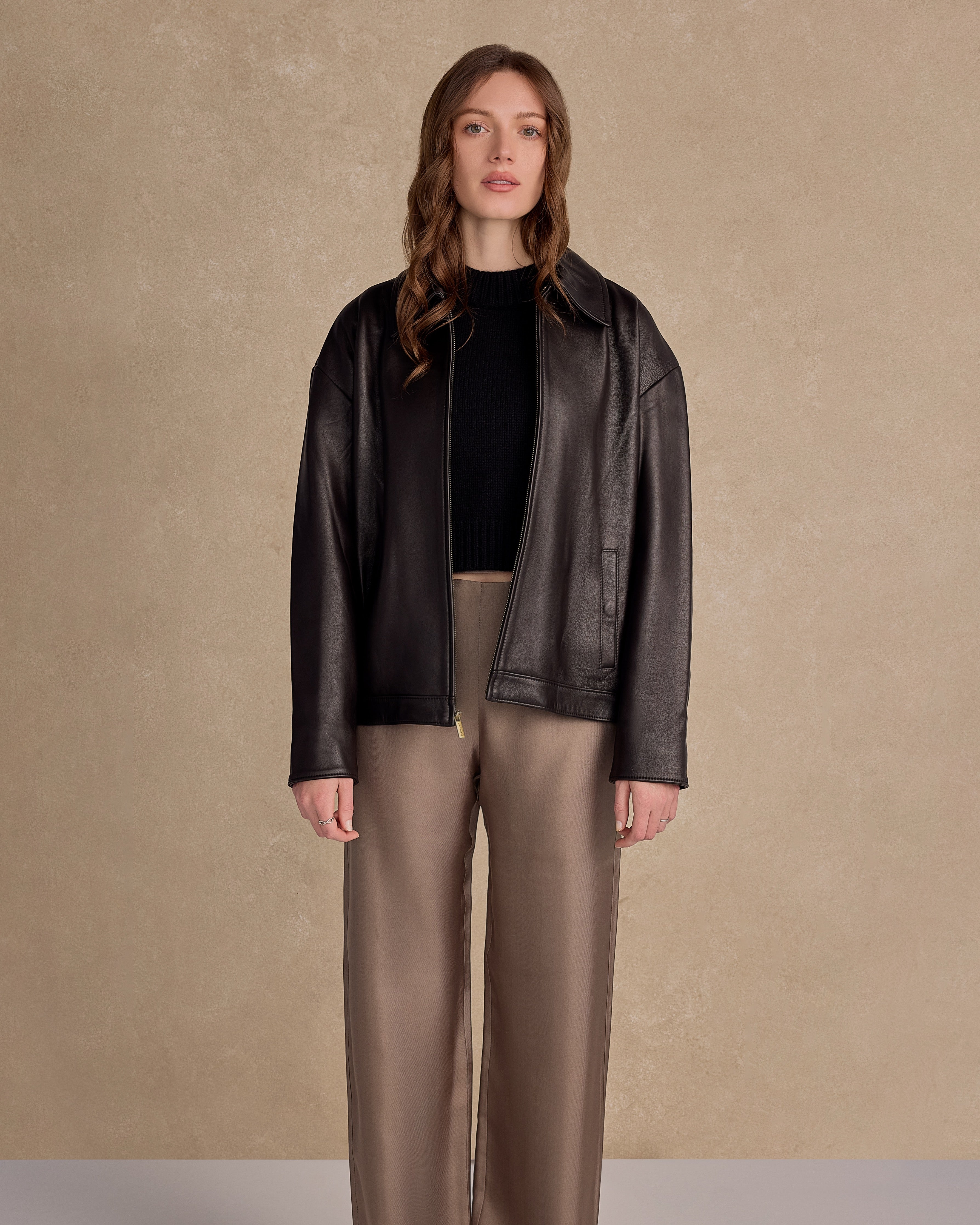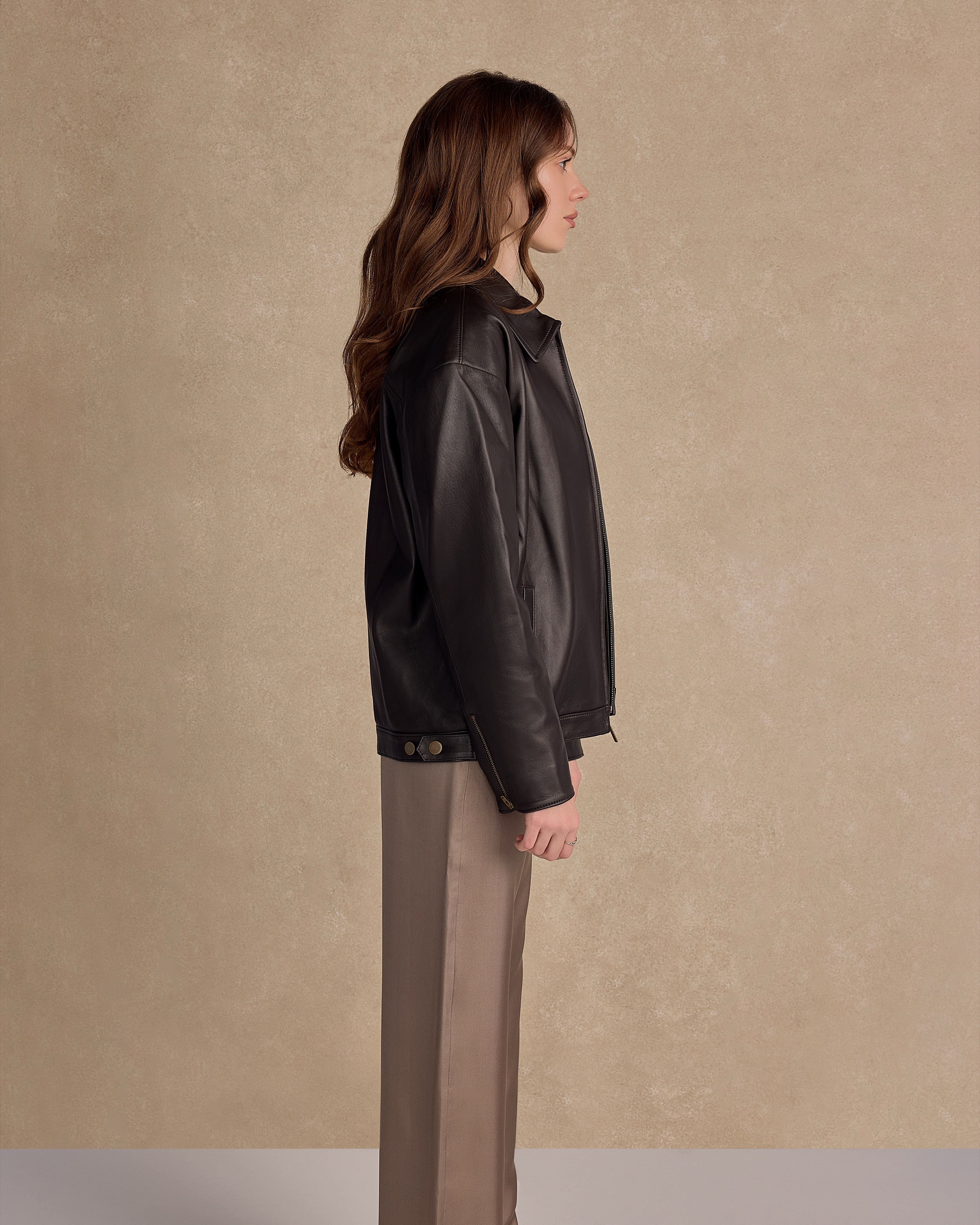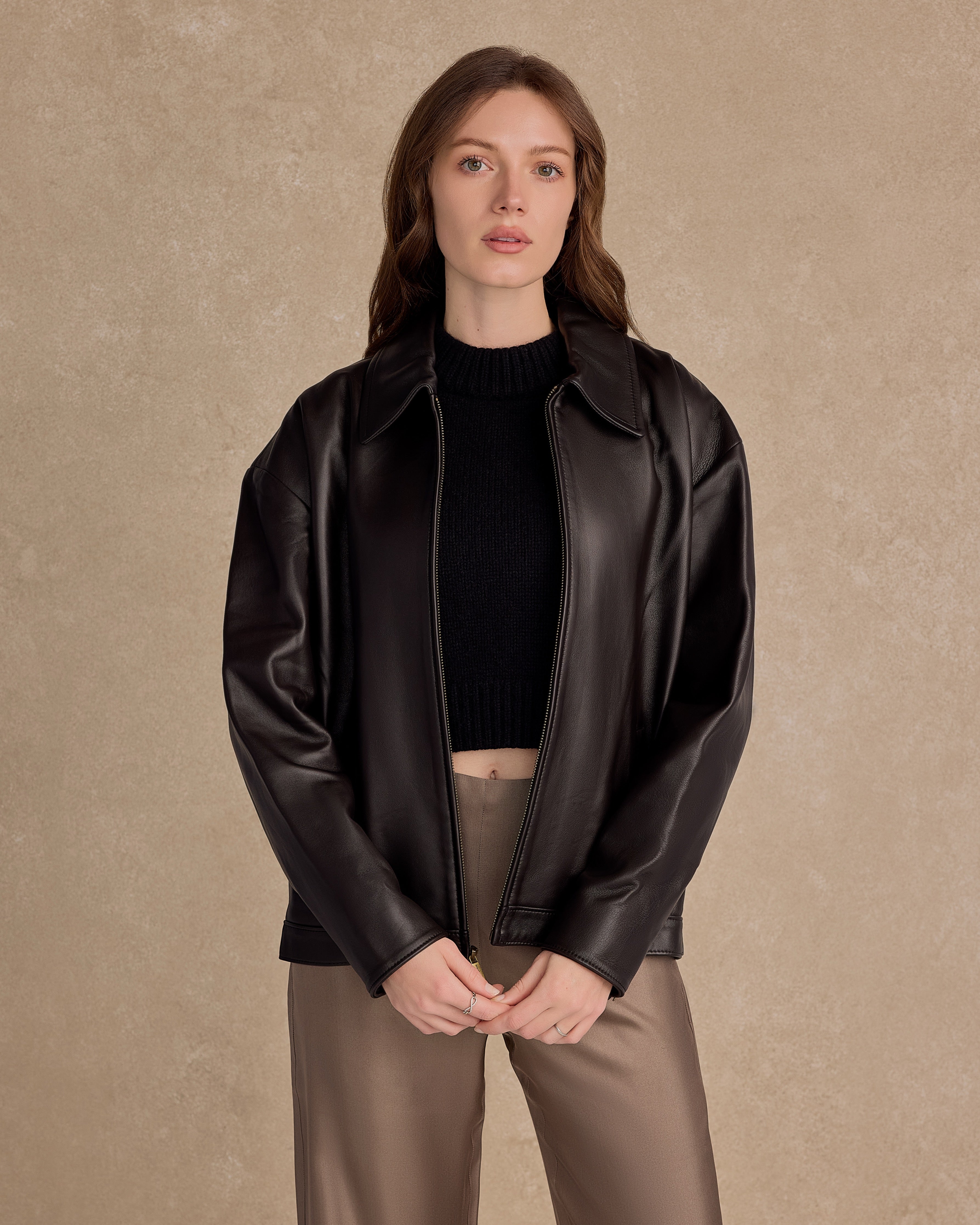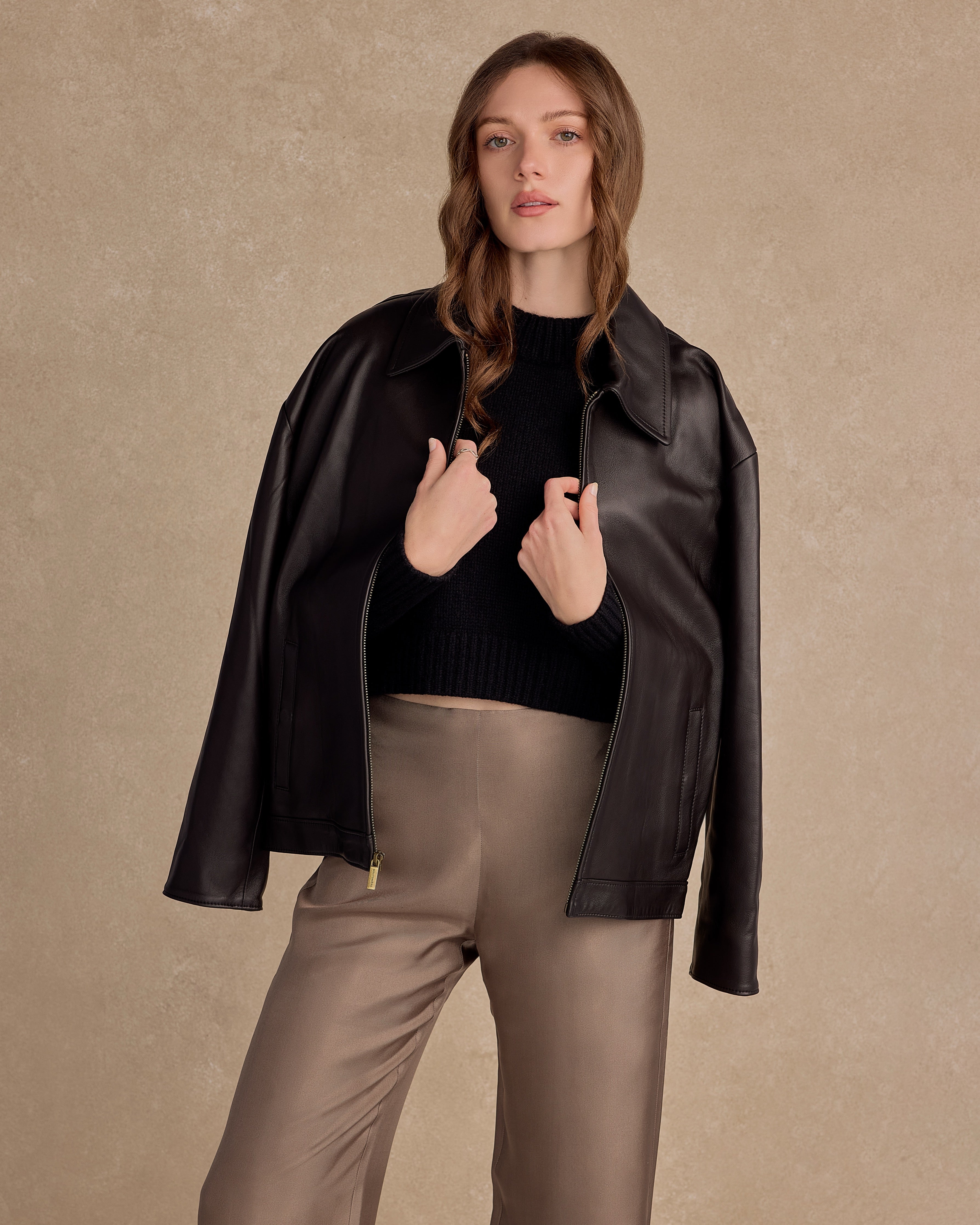 An elevated essential defined by structure and softness, the Classic Bomber reimagines a timeless silhouette in smooth lamb leather. Its clean architecture and fluid drape give the piece quiet sophistication, while a concealed zip and tonal details preserve a pure, uninterrupted silhouette.