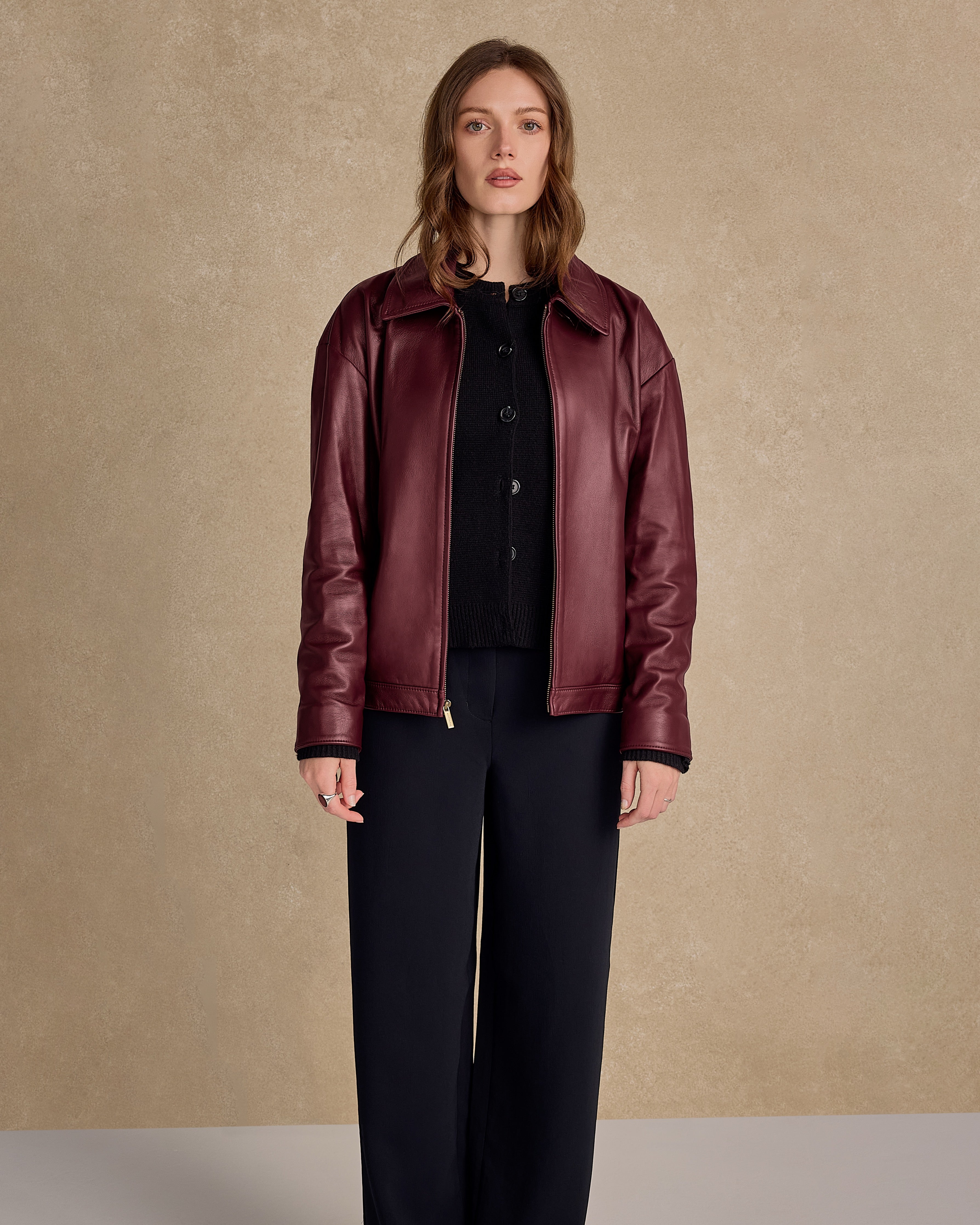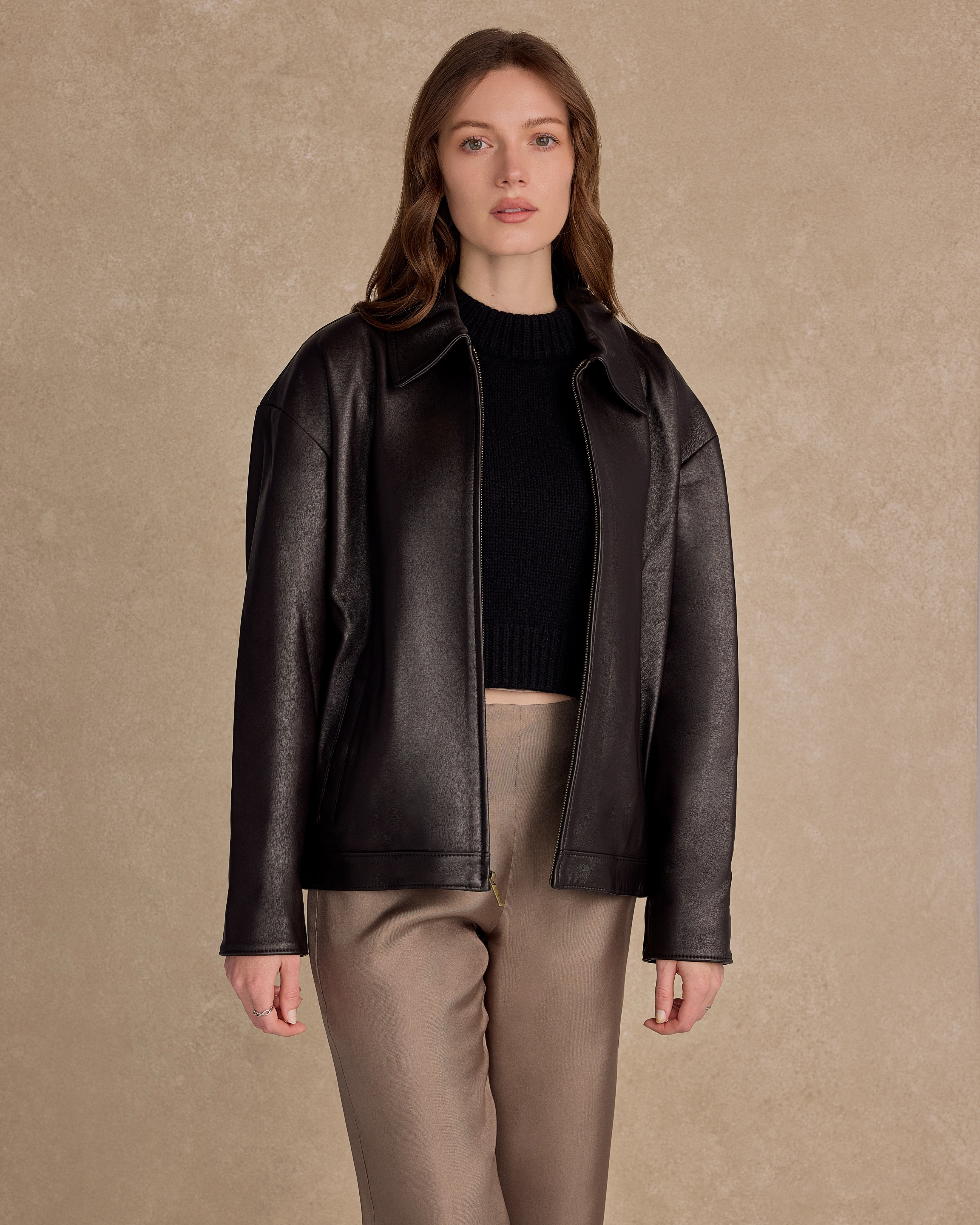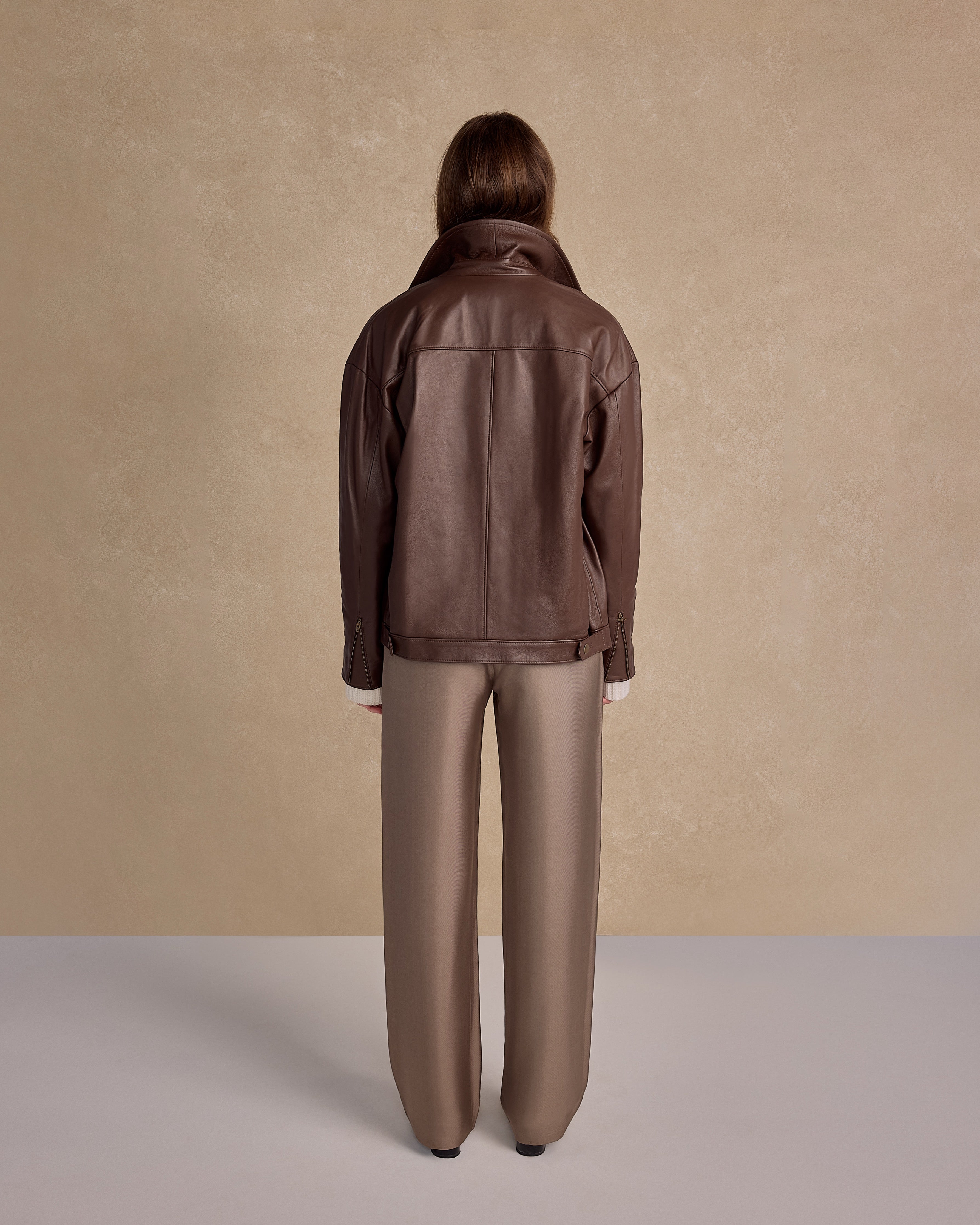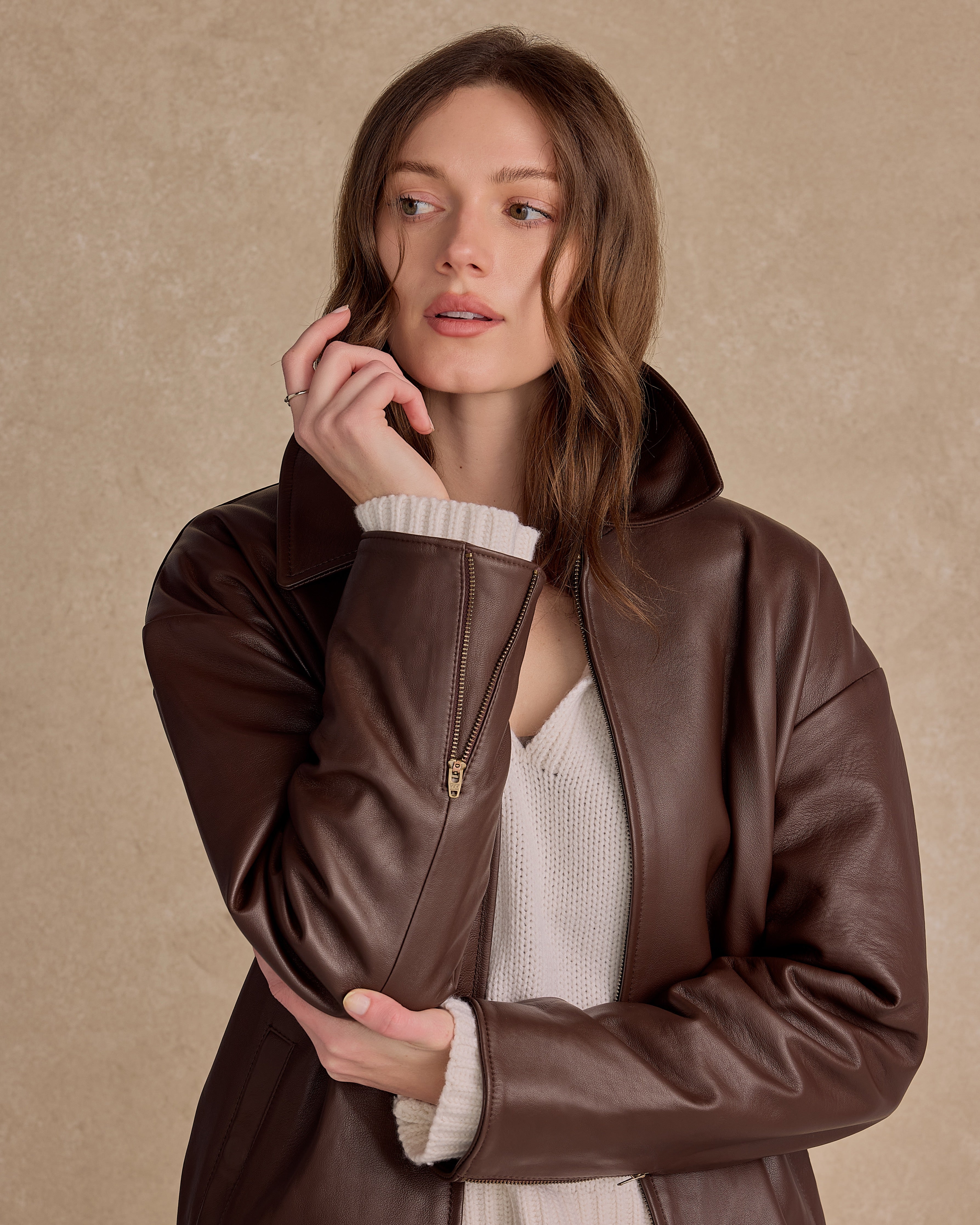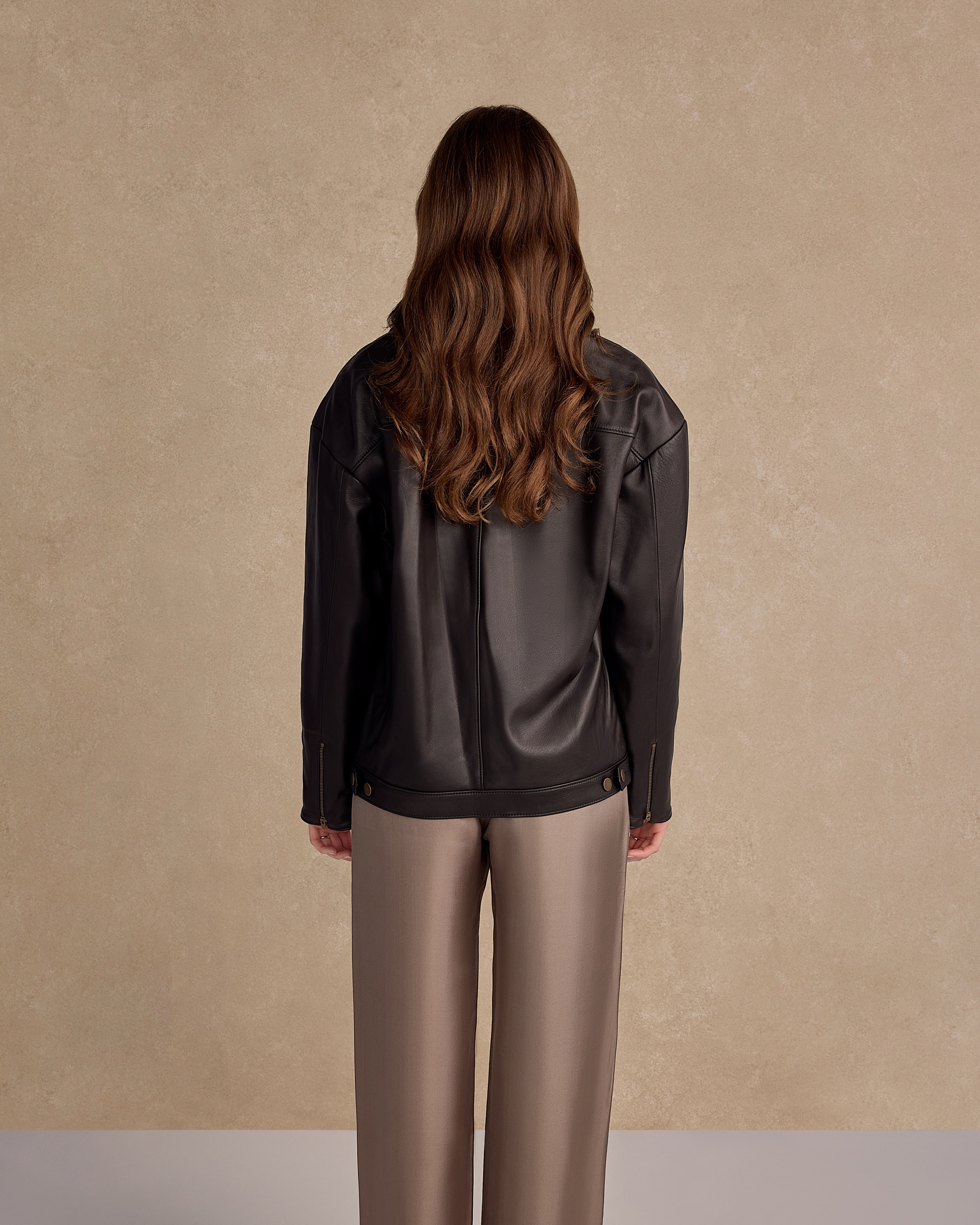 An elevated essential defined by structure and softness, the Classic Bomber reimagines a timeless silhouette in smooth lamb leather. Its clean architecture and fluid drape give the piece quiet sophistication, while a concealed zip and tonal details preserve a pure, uninterrupted silhouette.