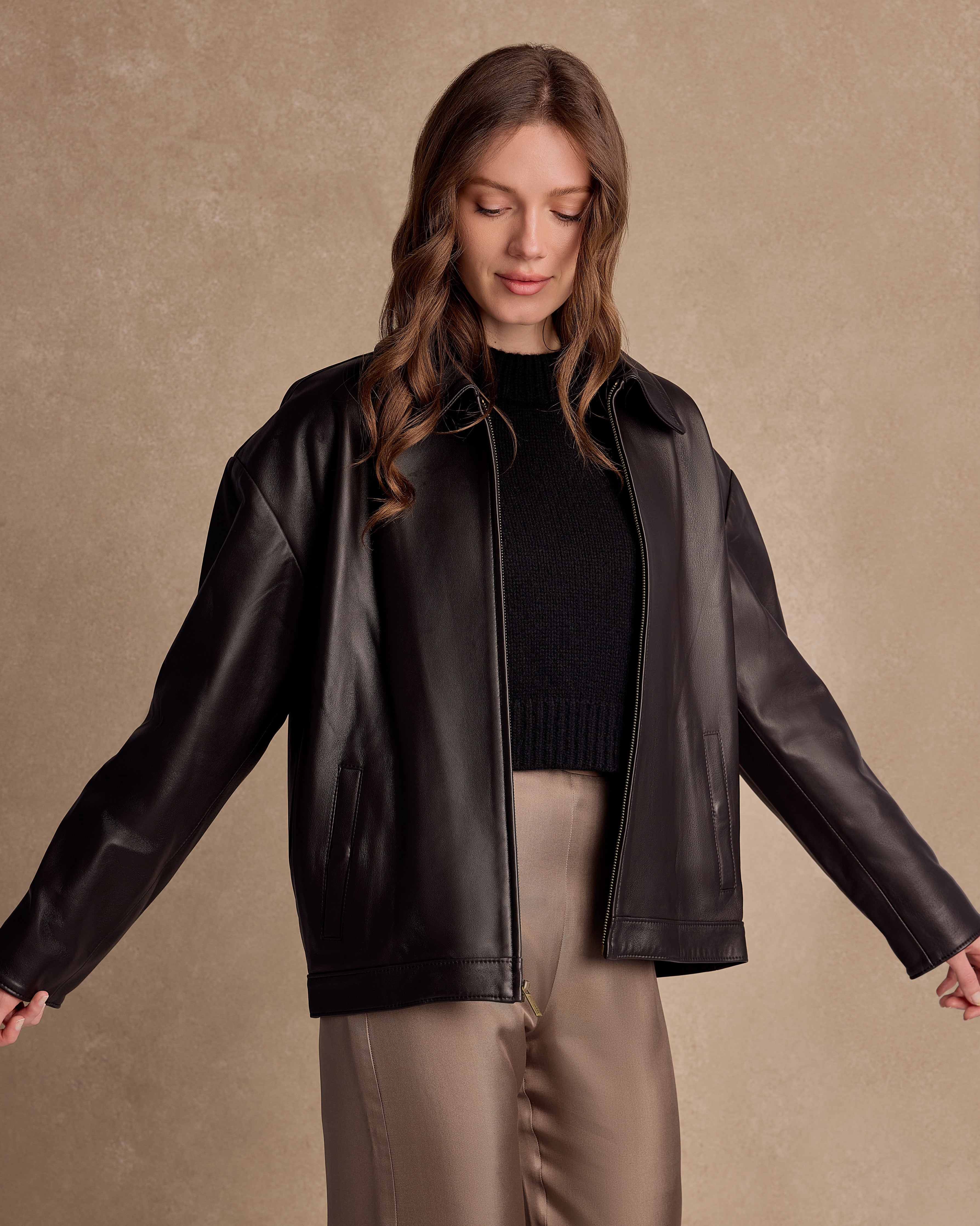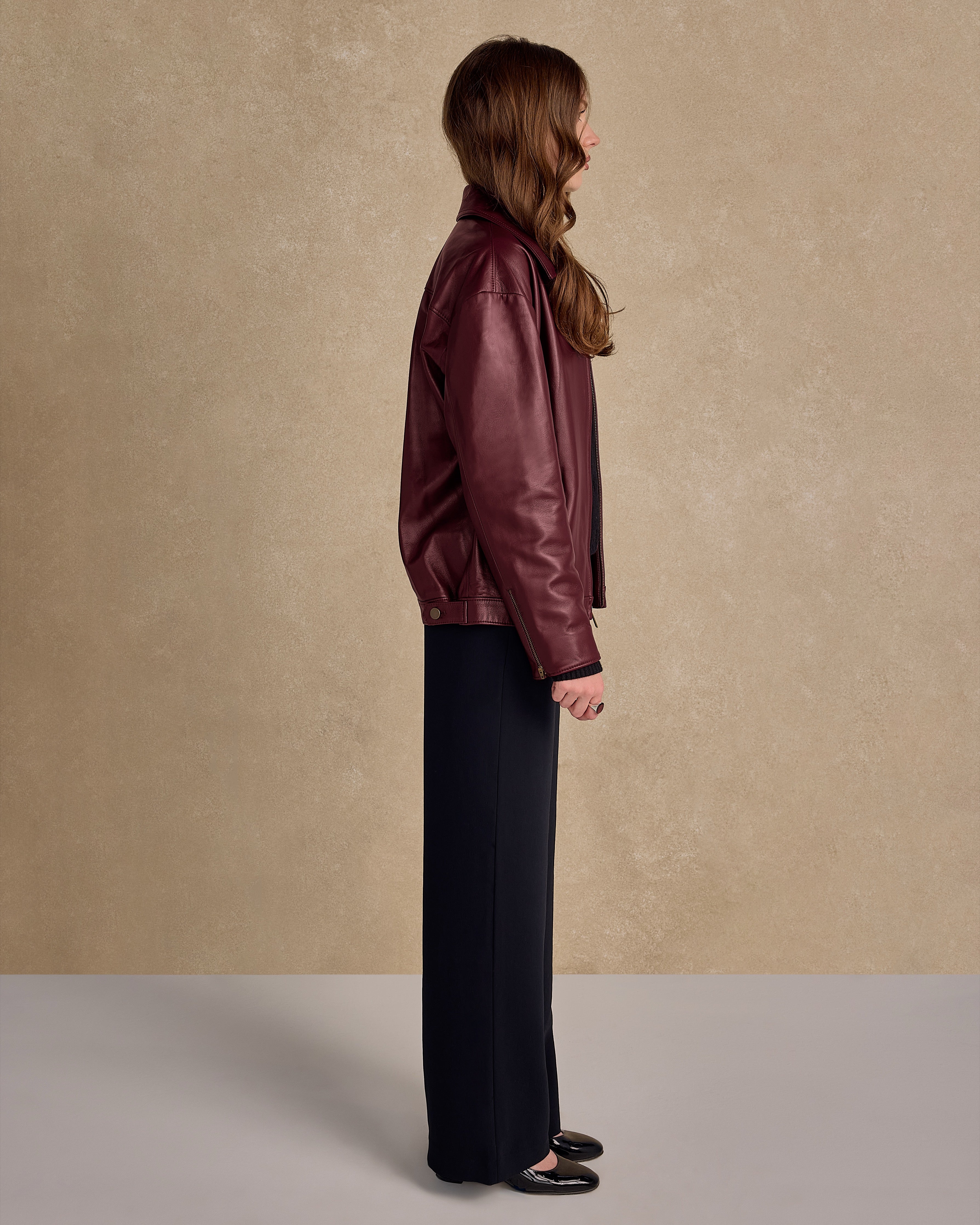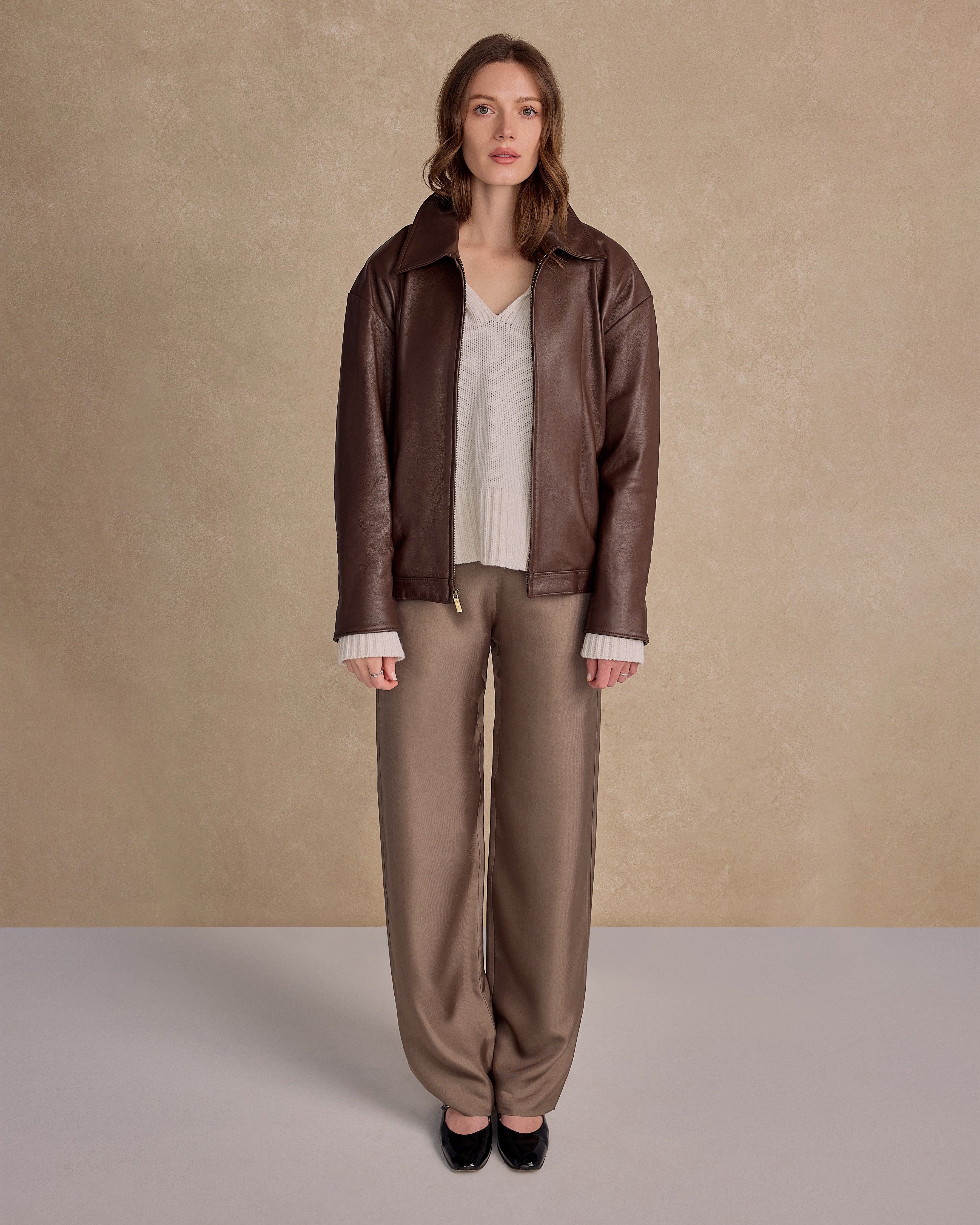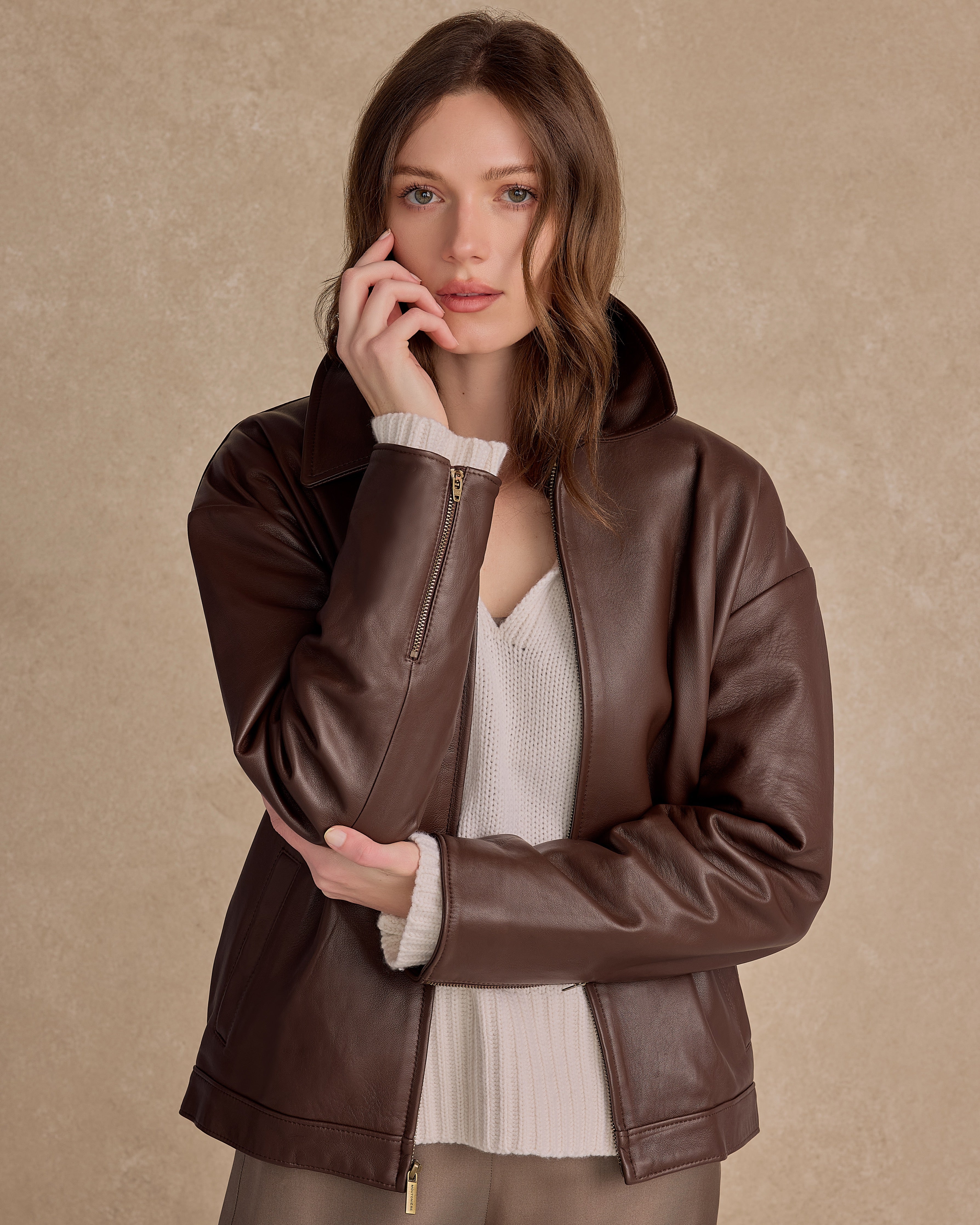 An elevated essential defined by structure and softness, the Classic Bomber reimagines a timeless silhouette in smooth lamb leather. Its clean architecture and fluid drape give the piece quiet sophistication, while a concealed zip and tonal details preserve a pure, uninterrupted silhouette.