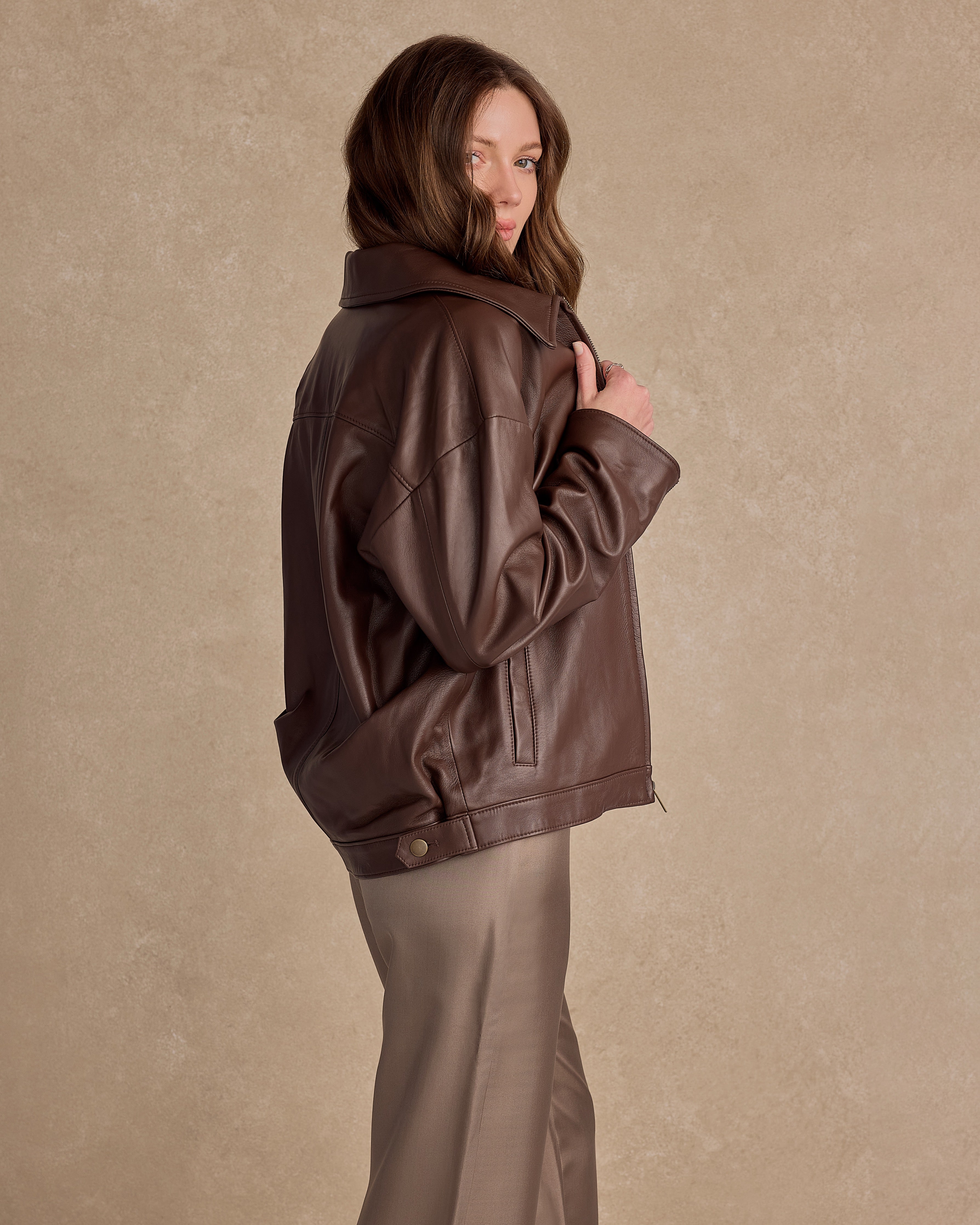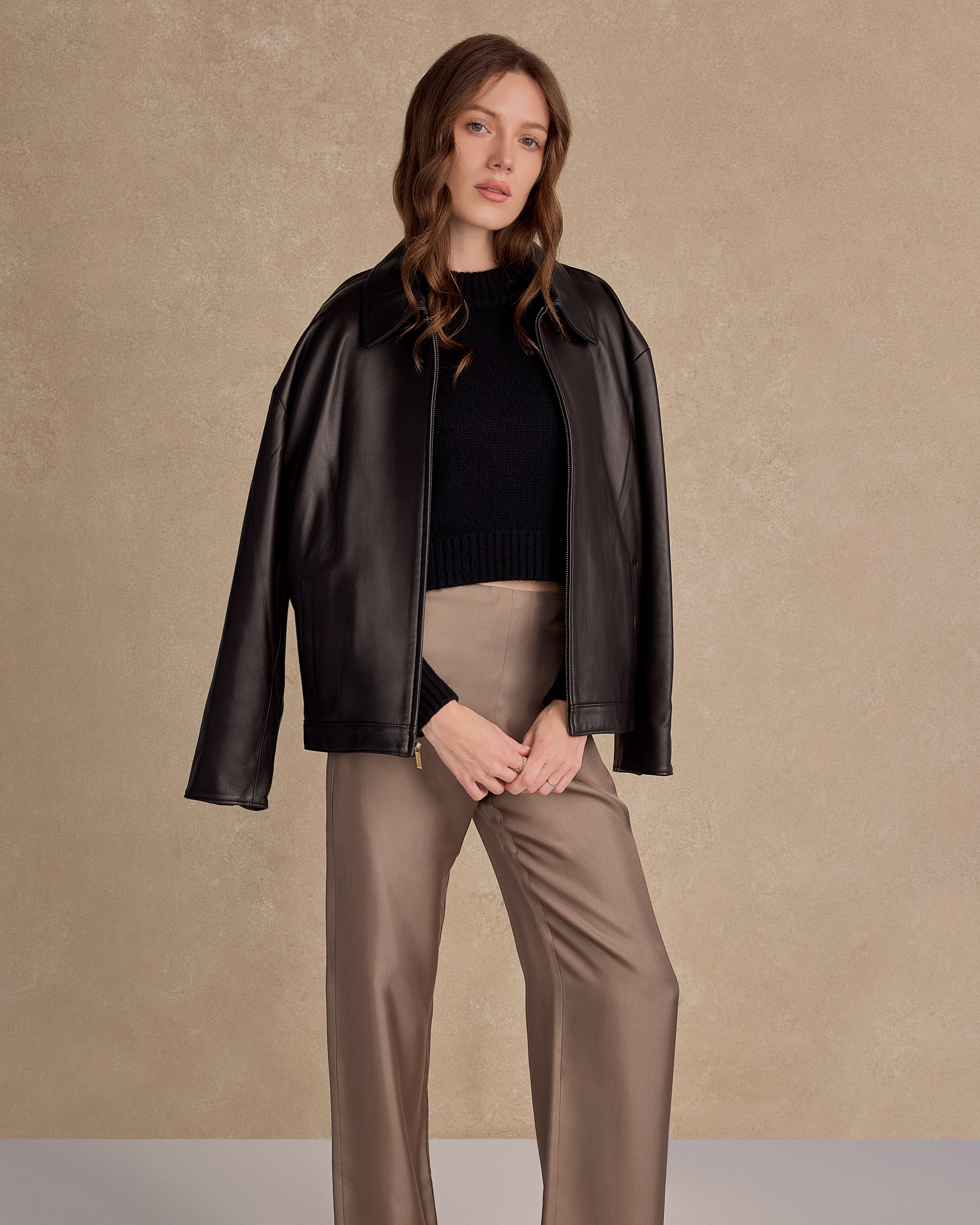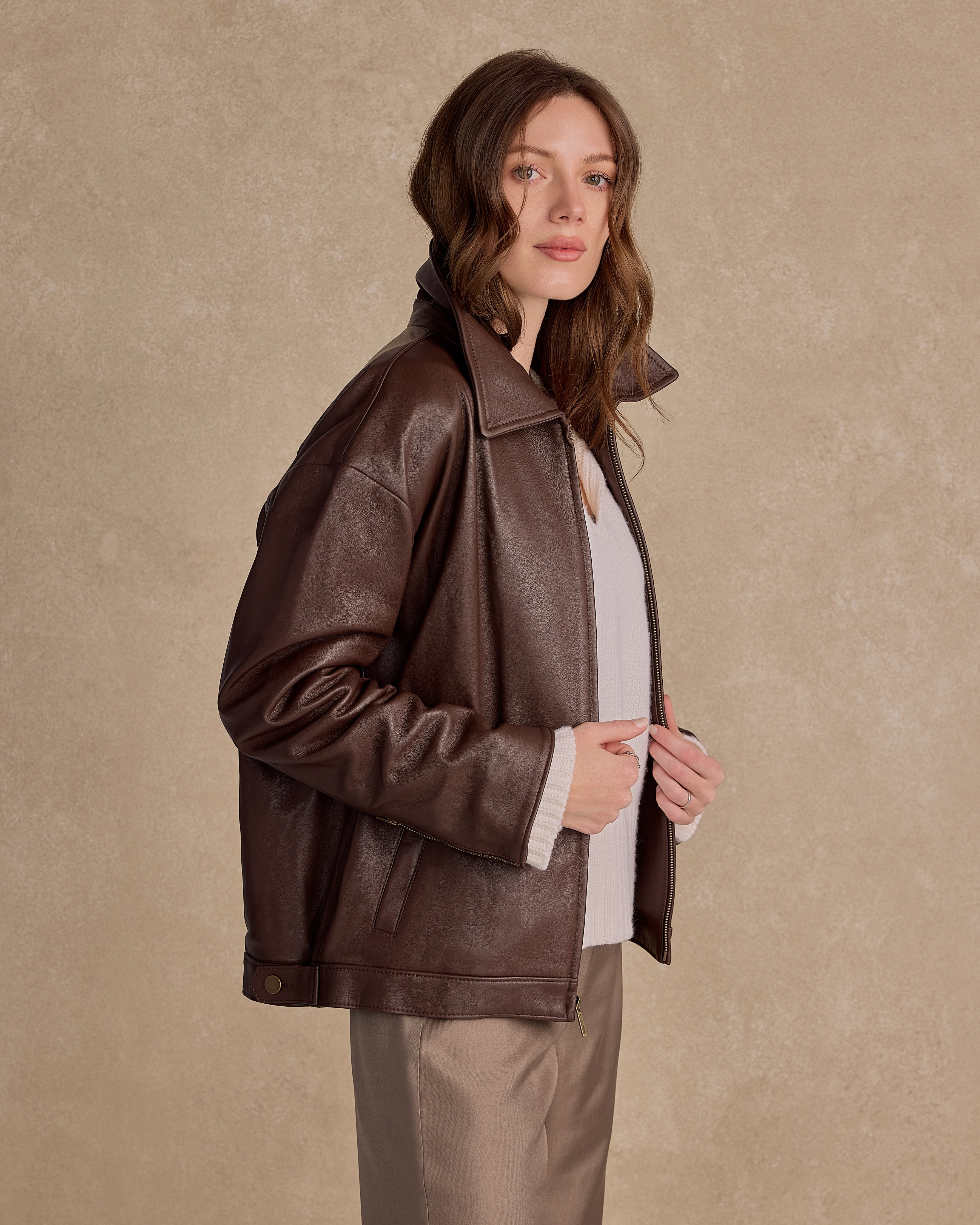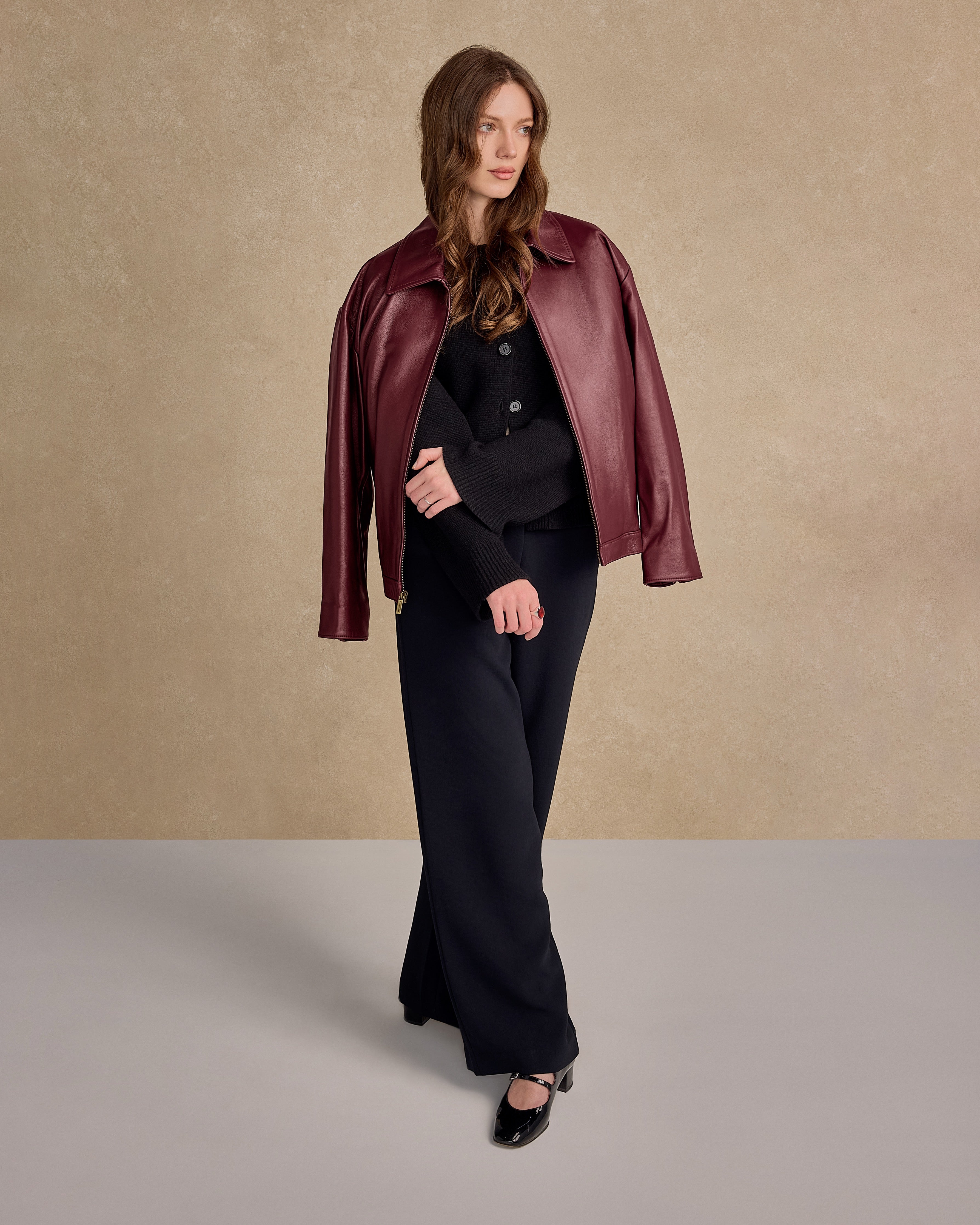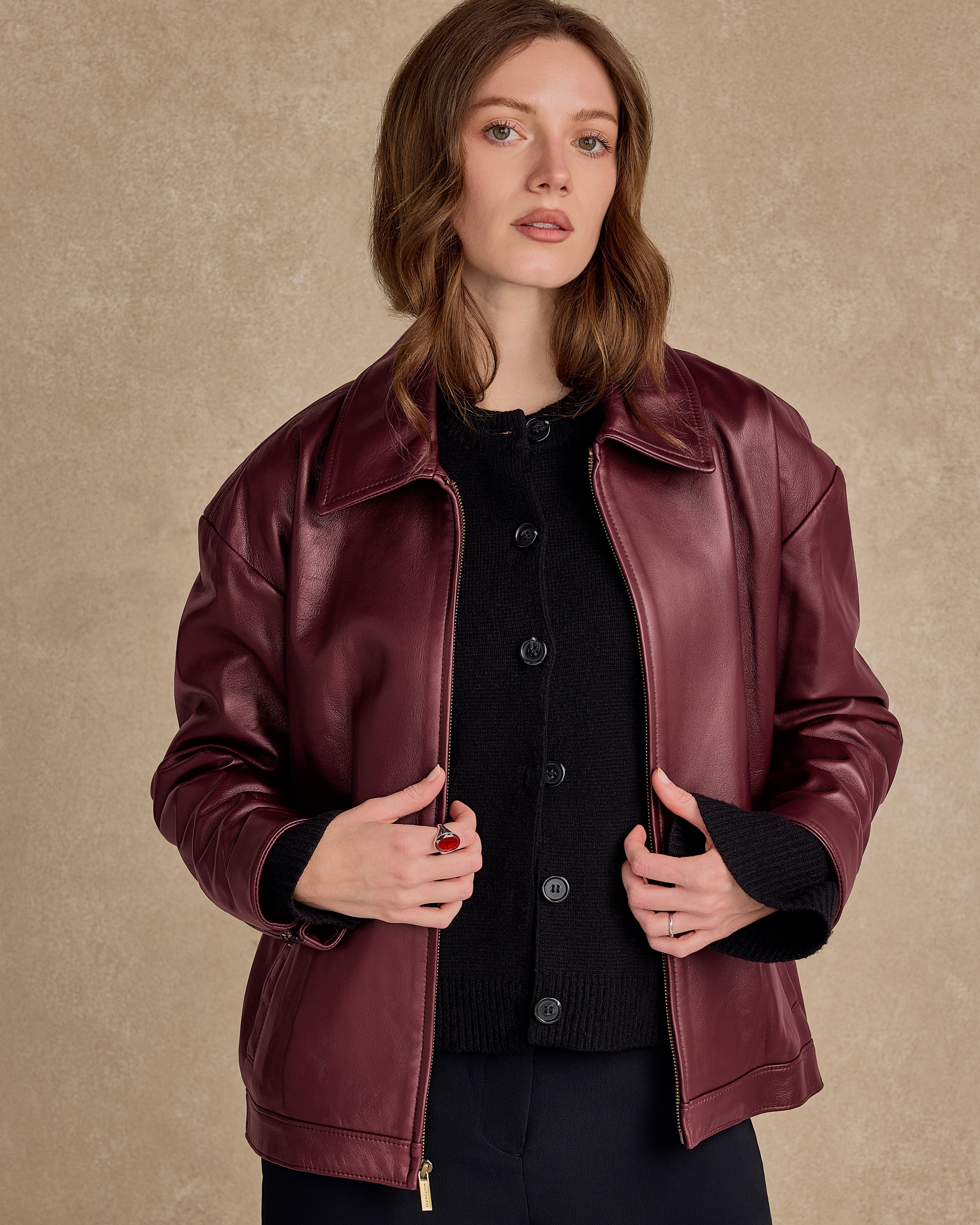 An elevated essential defined by structure and softness, the Classic Bomber reimagines a timeless silhouette in smooth lamb leather. Its clean architecture and fluid drape give the piece quiet sophistication, while a concealed zip and tonal details preserve a pure, uninterrupted silhouette.
