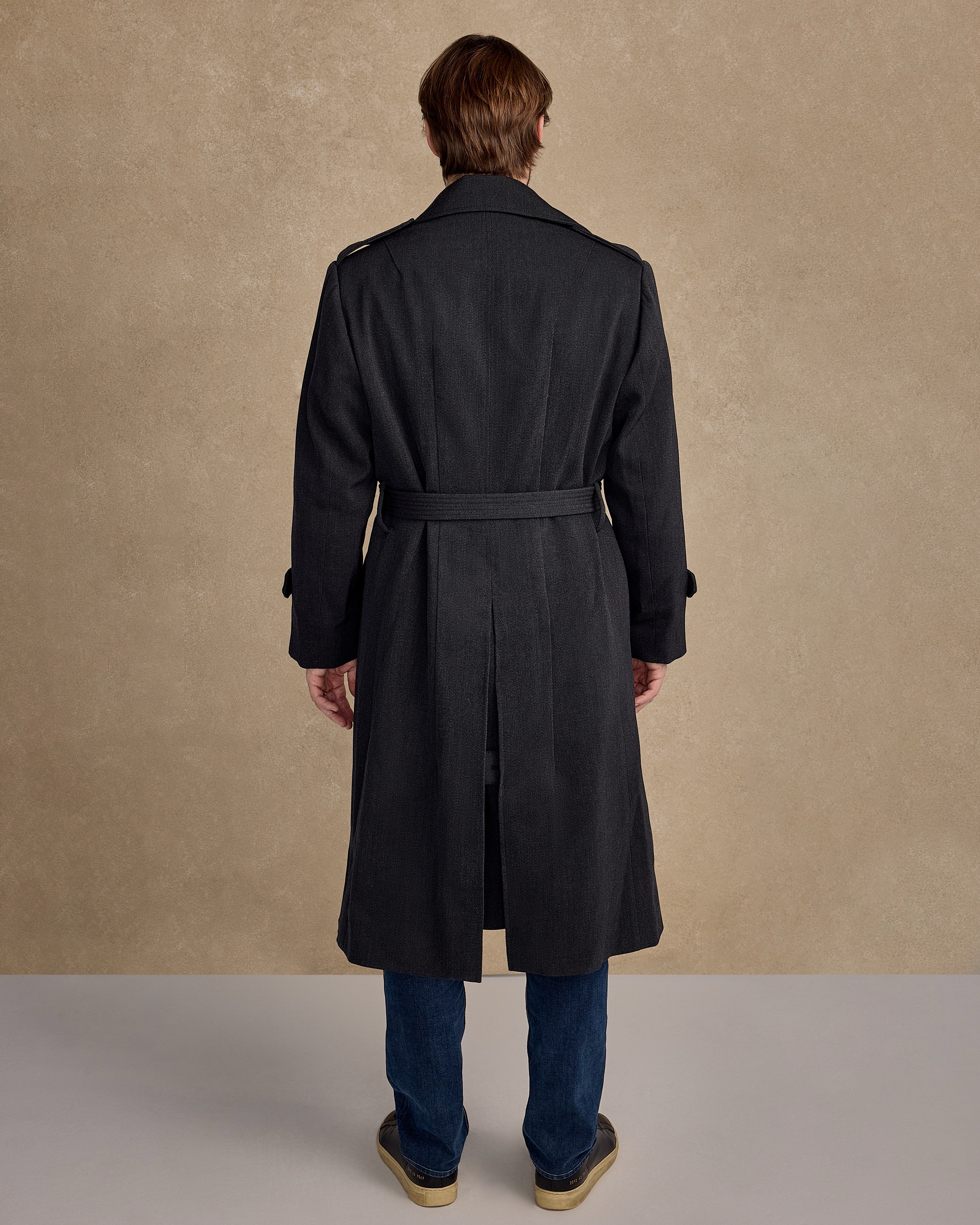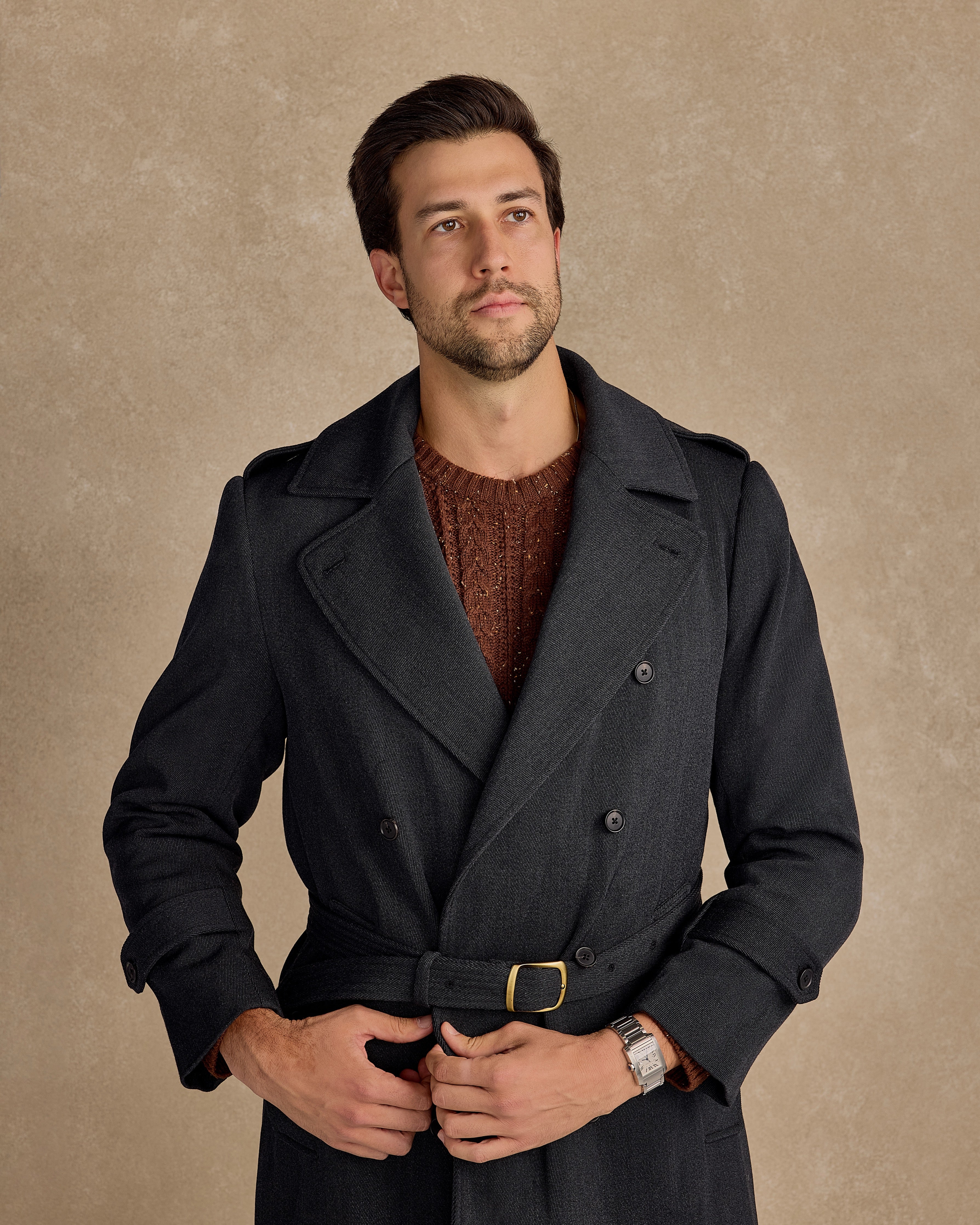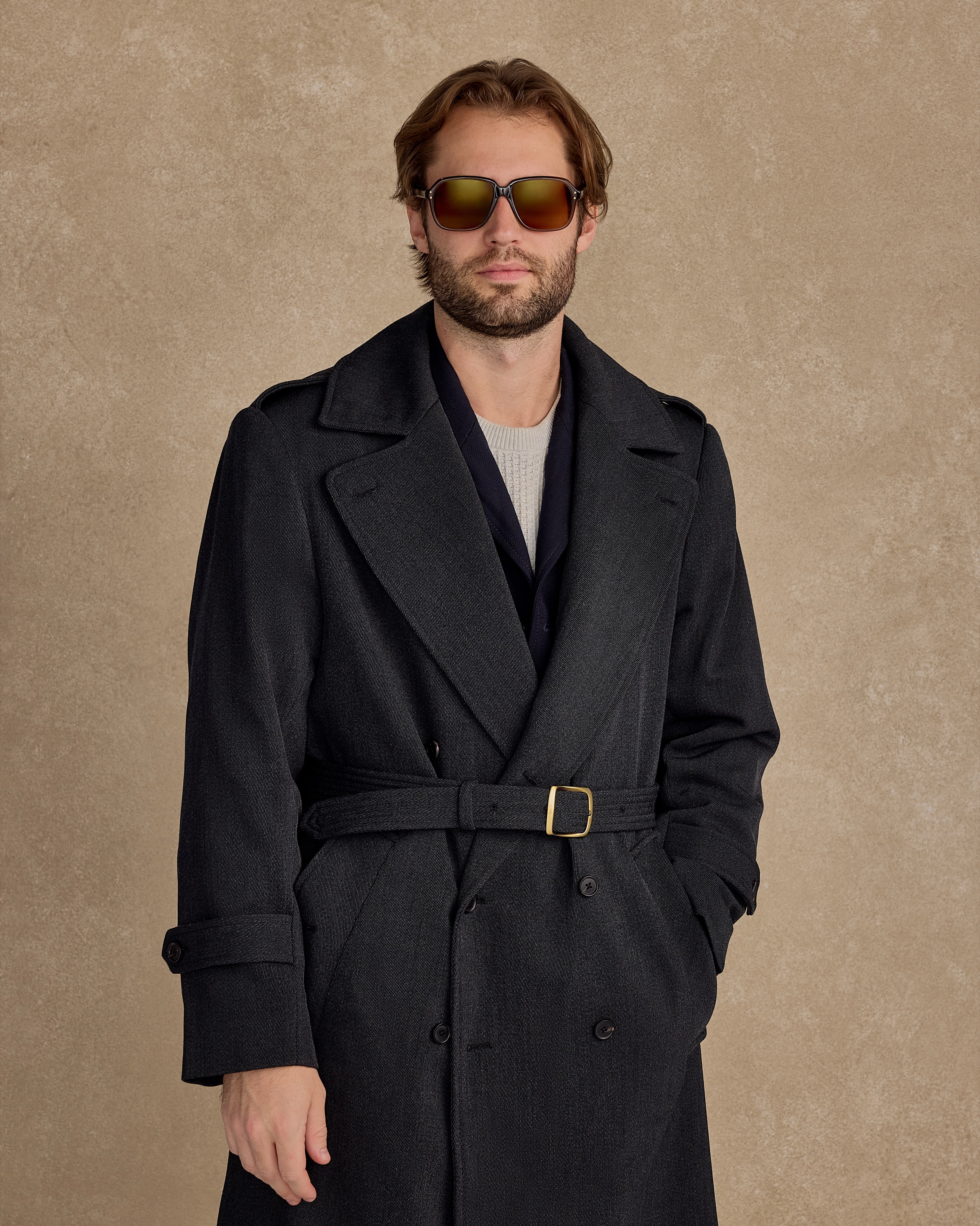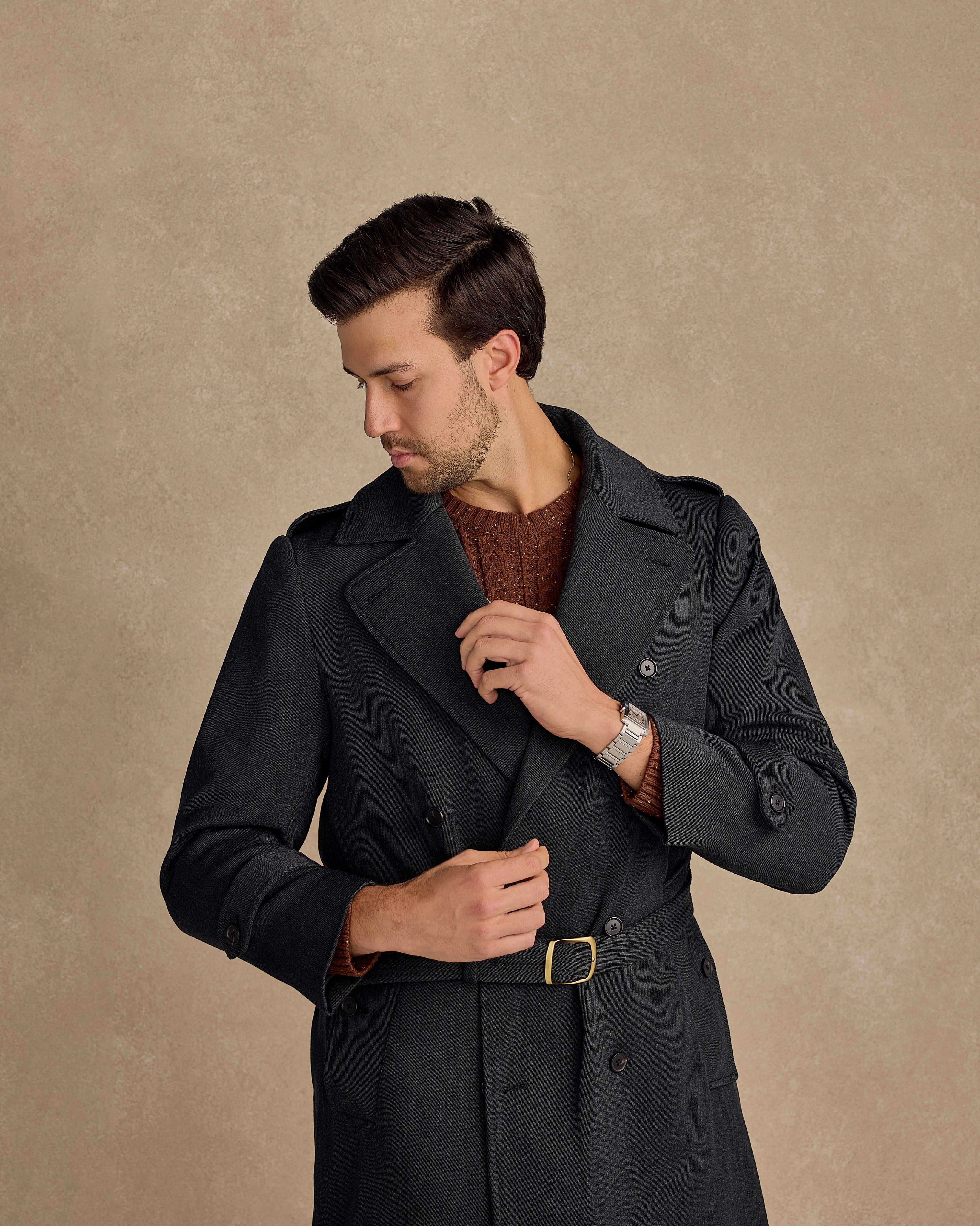 A swelled front edge and expanding back vent give structure and movement, tailoring details drawn from Savile Row bespoke. Worn belted for definition or loose for a relaxed drape, collar up or down, the classic trench is as adaptable as its heritage demands: field coat, spy coat, or commuter’s armor.