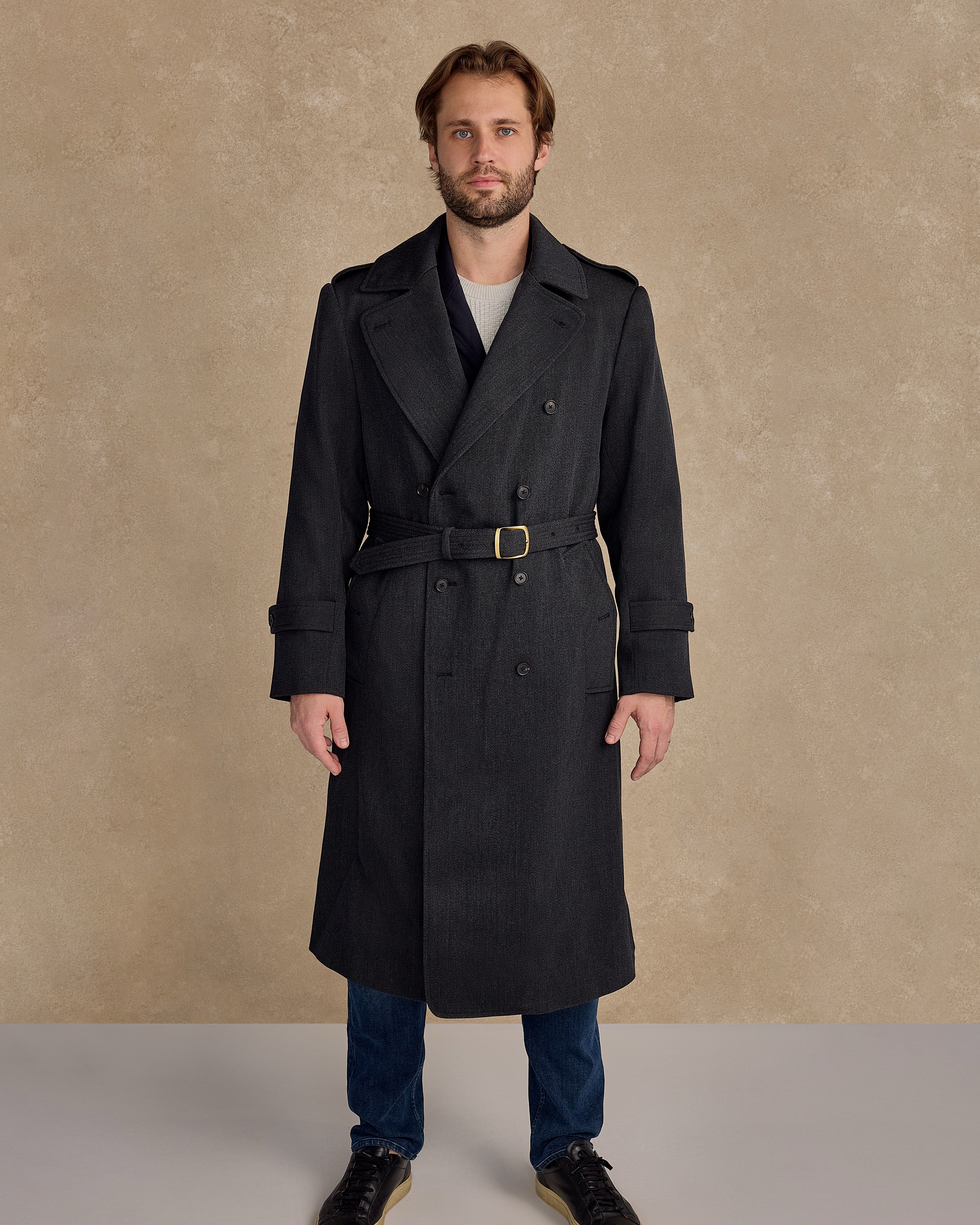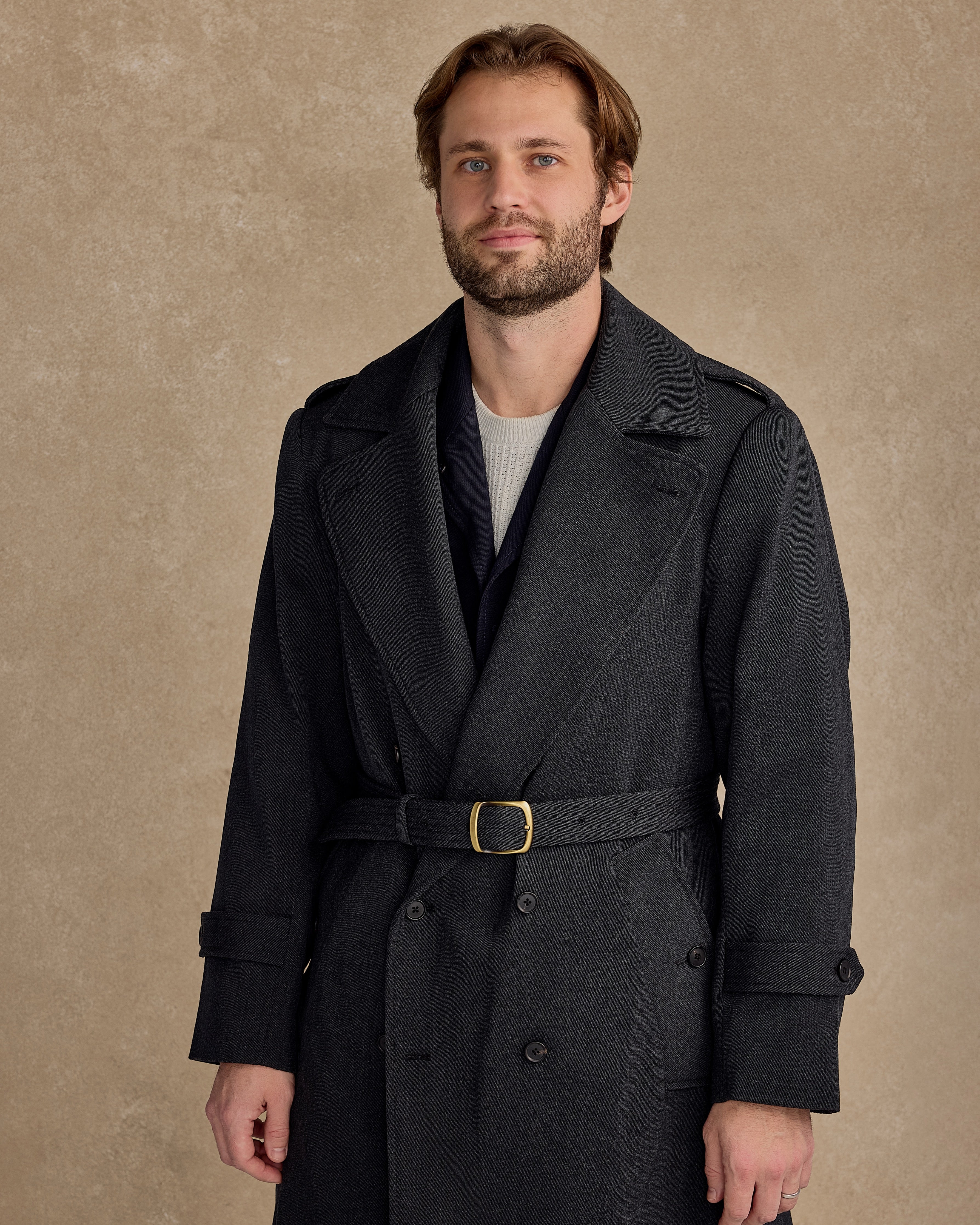 We’ve preserved historical details, including the 8x3 button stance with horn buttons, the five-row-stitched belt with brass buckle, the storm pockets deep enough for your daily kit, sleeve loops that tighten for warmth and to block rain or snow, passenten shoulder straps to hold epaulets of rank — or a scarf, or the strap of a bag, and oversized lapels that turn up dramatically and fasten across the body in the wind.