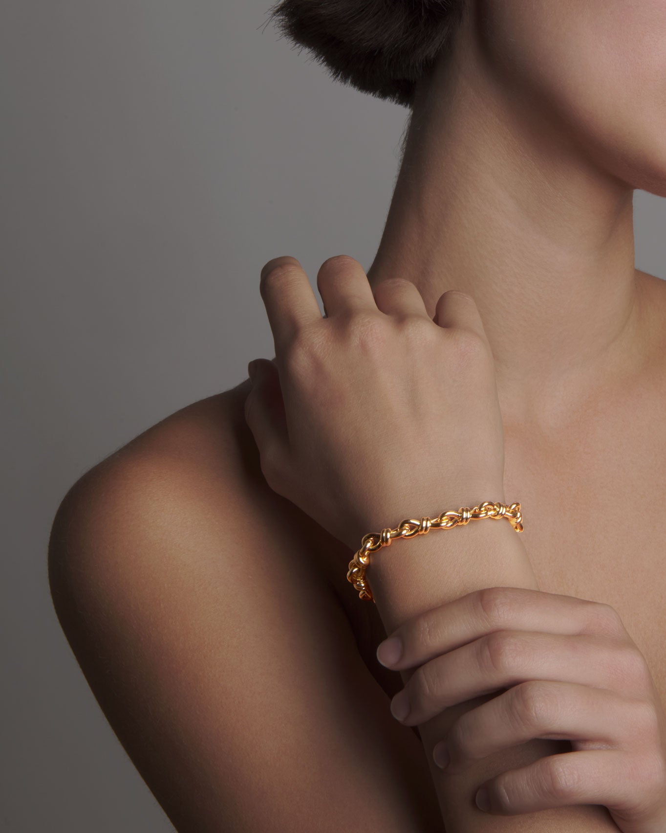 Each link is meticulously shaped and polished by hand, allowing the bracelet to move fluidly while maintaining a tactile sense of weight and balance. The gleam of gold or silver catches the light like sun on water, transforming an elemental form into a piece of quiet sophistication.